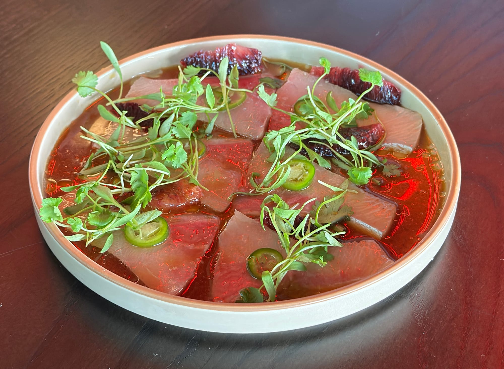 The wine list is thoughtful and globally minded, and the cocktails are equally considered. I opted for the house Negroni ($12), made with Roku gin and the requisite Campari but spiked with ume plum liqueur and a splash of sake. It’s still spirit-forward, but the exotic additions lend a subtle roundness. Cocktail in hand, I clinked glasses with my friends who came equipped with adventurous appetites and zero fear of over-ordering, and we developed our game plan: Say yes to everything.