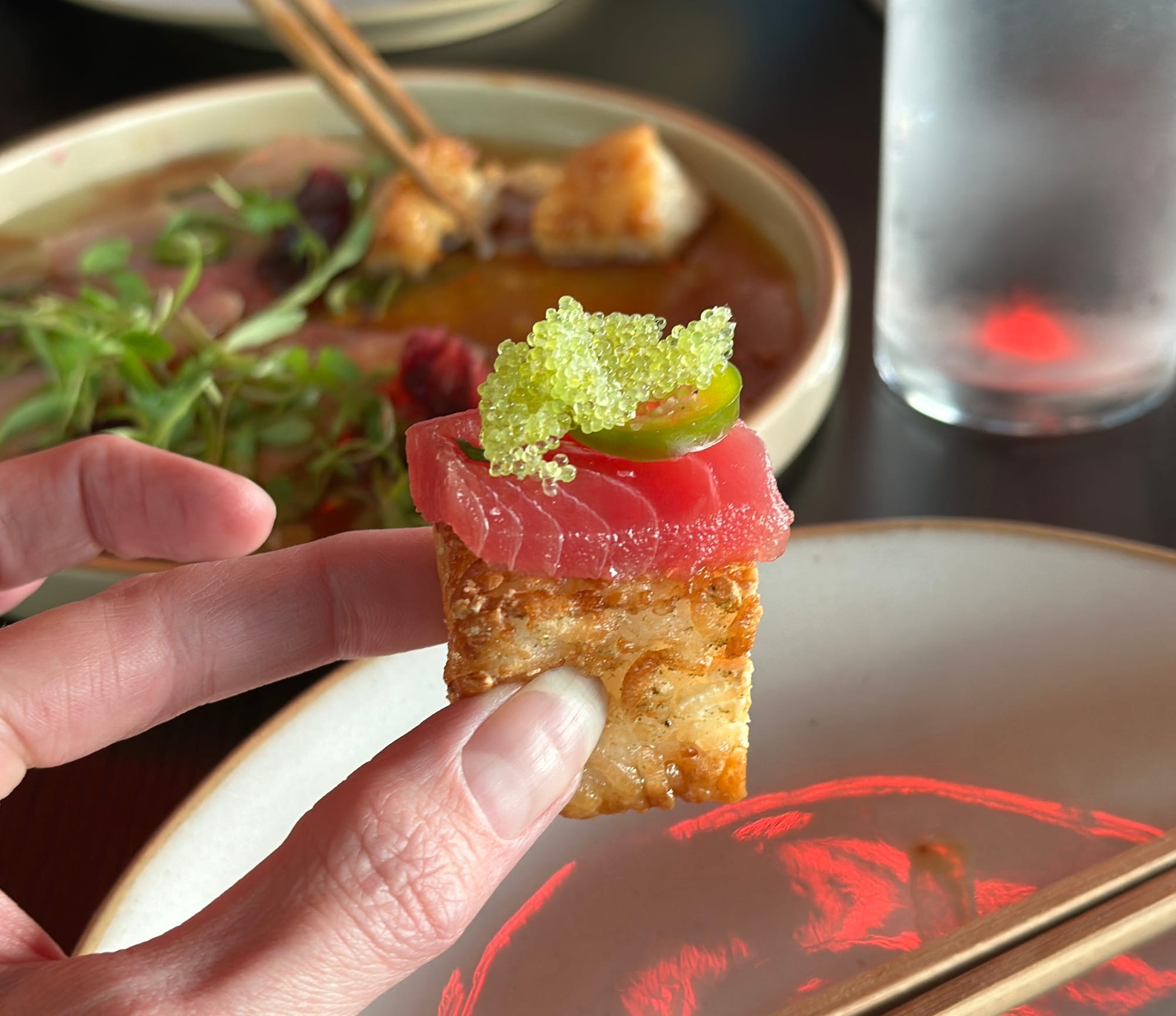The building’s design is minimalist but grounded—clean-lined and wood-wrapped, with a quiet elegance that feels purpose-built for the river. It’s not trying to be a boathouse, but it understands the rhythm of water. A glowing red neon dragon coils overhead, a wink to the fantastical that doesn’t feel kitschy. Reservations are highly recommended for dining room seating, where the lighting is low, the vibe dialed-in, the views immaculate. The bar is first-come, first-served, as is the patio with its mix of high tops and cushioned lounge seating. Daytime at Daigoro is more serene; nighttime is magnetic.