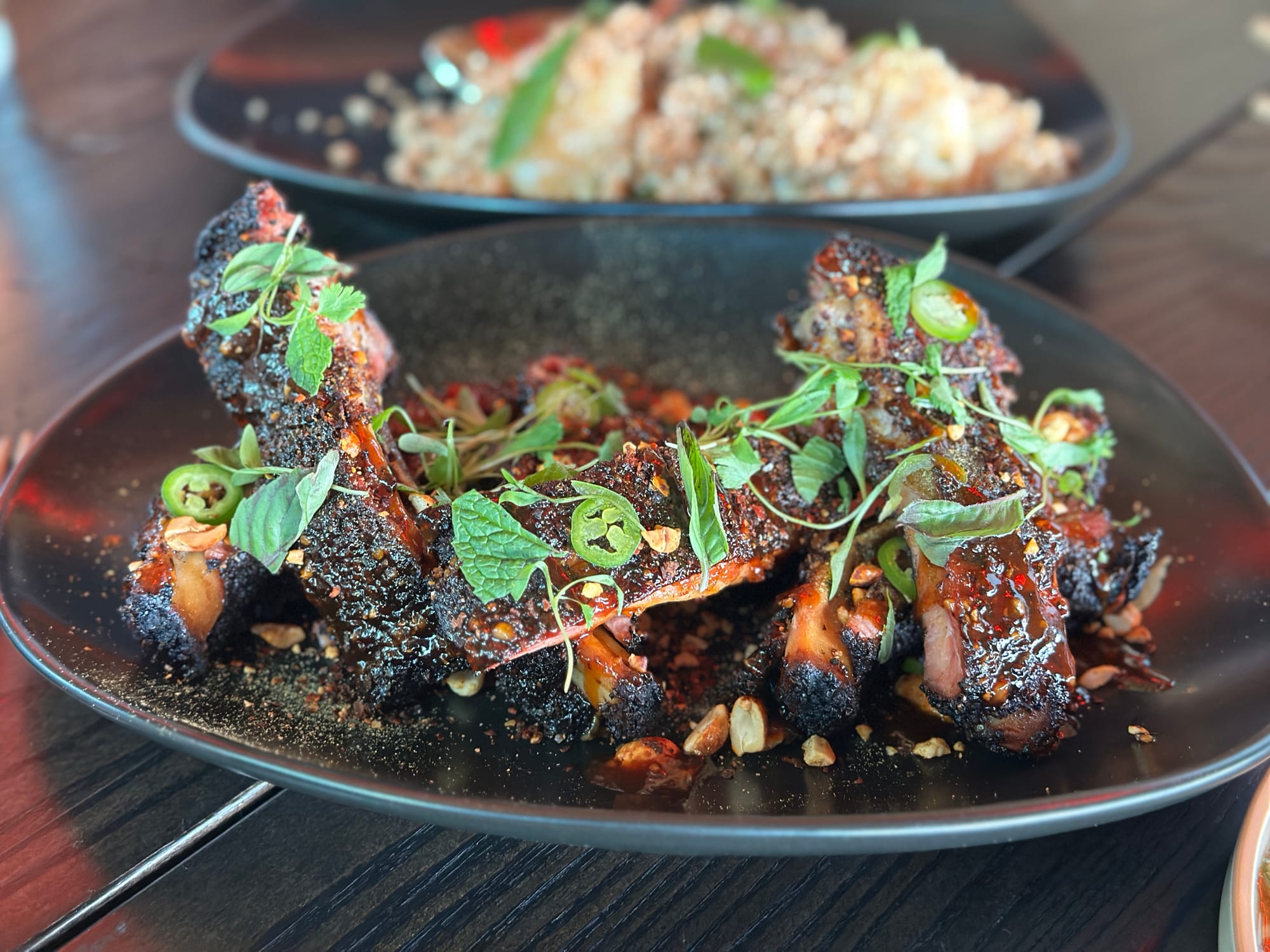 The Baby Back Ribs (half rack $25) are a hulking, black-lacquered affair—post-oak smoked, glazed in strawberry gochujang, then topped with peanuts, kaffir lime, serrano, and herbs. The spice and bitter char overwhelmed my palate, which isn’t usually averse to heat, and only grew more intense with each bite. I may have drawn the rogue rib of the rack because my pals, all sauce-smeared and smiling, devoured theirs without issue. Our server, who was fantastic, let me know they can accommodate spice levels; just ask.