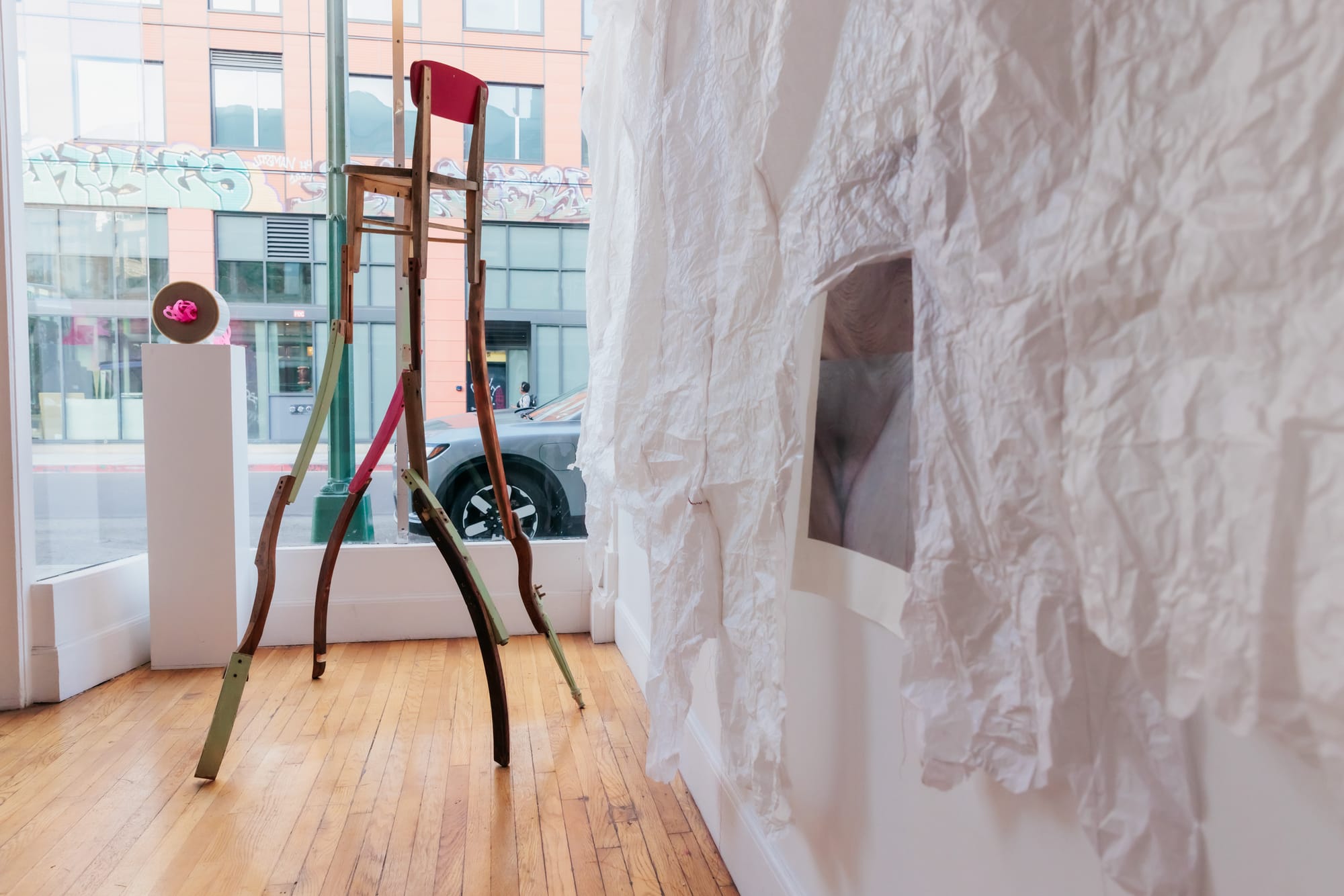 In her statement, Duren explained that she “investigates ideas of Repair, Restoration, and Resilience through a practice of play in the face of uncertainty, as a response to her own internal world and the external entropy of the present day.” The artist’s discomfort was almost tangible in one wall, where sewn paper—the white sort from doctor visits—revealed a black-and-white print of a vulva, exposed in vulnerable detail. Though it may seem overt, this use of the body as metaphor reflected Duren’s distress over the world’s uncertainty, her statement highlighting her struggle to make sense of a shifting political landscape.