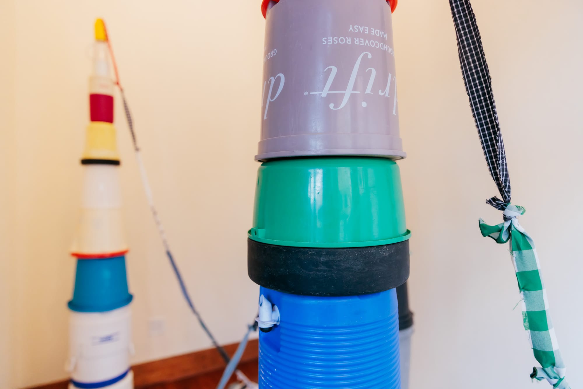 A few doors down, sculptures made from discarded plastic containers were precariously stacked to form spires for King’s “Vexed Insurrection,” filling Ricky’s Barbershop Annex, Dream Farm’s secondary space. The shapes, reminiscent of Gaudi's pinnacles of the Evangelists, feature lines of plastic and string leading from their tips to the floor, where perfect round nests of rags lay. While the materials are far from precious, these pieces create a sobering commentary on waste culture, unapologetically embracing the detritus of our civilization. They refuse to transform or disguise their origins, instead tugging at the viewer's guilt upon confronting the waste created from objects we often use.