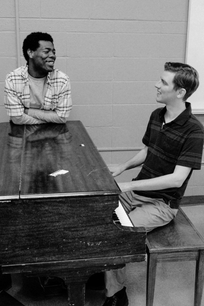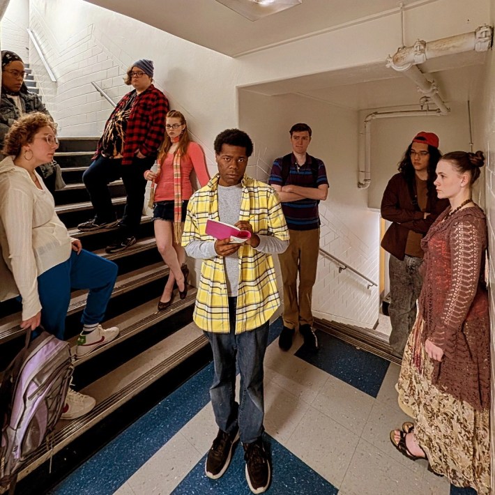 Amidst the play’s sea of angst, GoldenBough found moments for tenderness that felt like a breath of fresh air. In act one, overcome with grief about the death of his dog, CB is lured to a music room where Beethoven, played by Caleb Baumgartner, is practicing piano. These childhood friends find themselves on the outs at the start of the play, as CB is part of the popular group that bullies Beethoven for his perceived queer identity, and this initial meeting is awkward. I was gripped by the way GoldenBough guided these actors through CB’s despair and Beethoven’s anger—an almost-fight—and into the two characters falling in love while playing “Heart and Soul” on the piano. Thanks to the direction and Stubblefield and Baumgartner’s stellar performances, this was the best scene in the show.