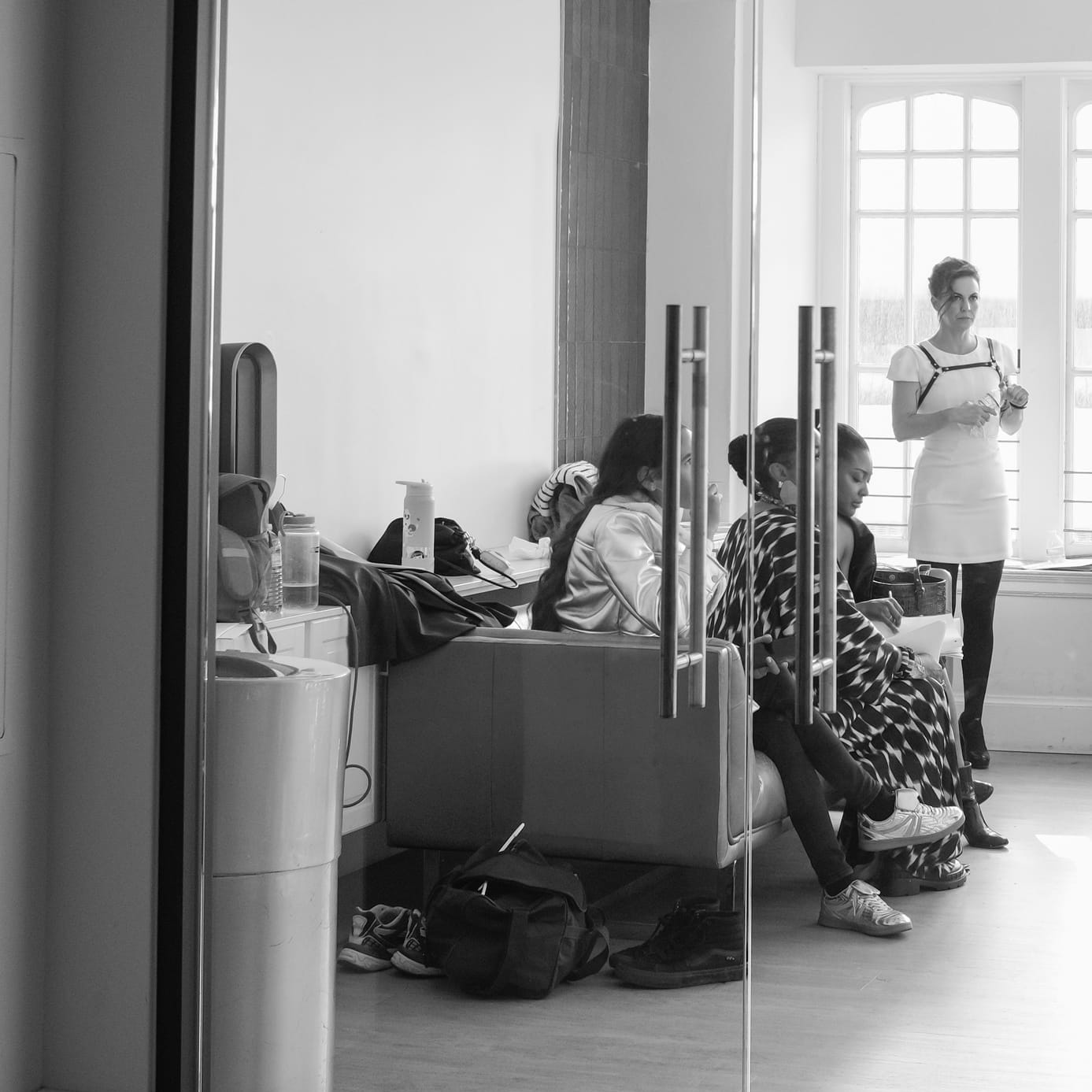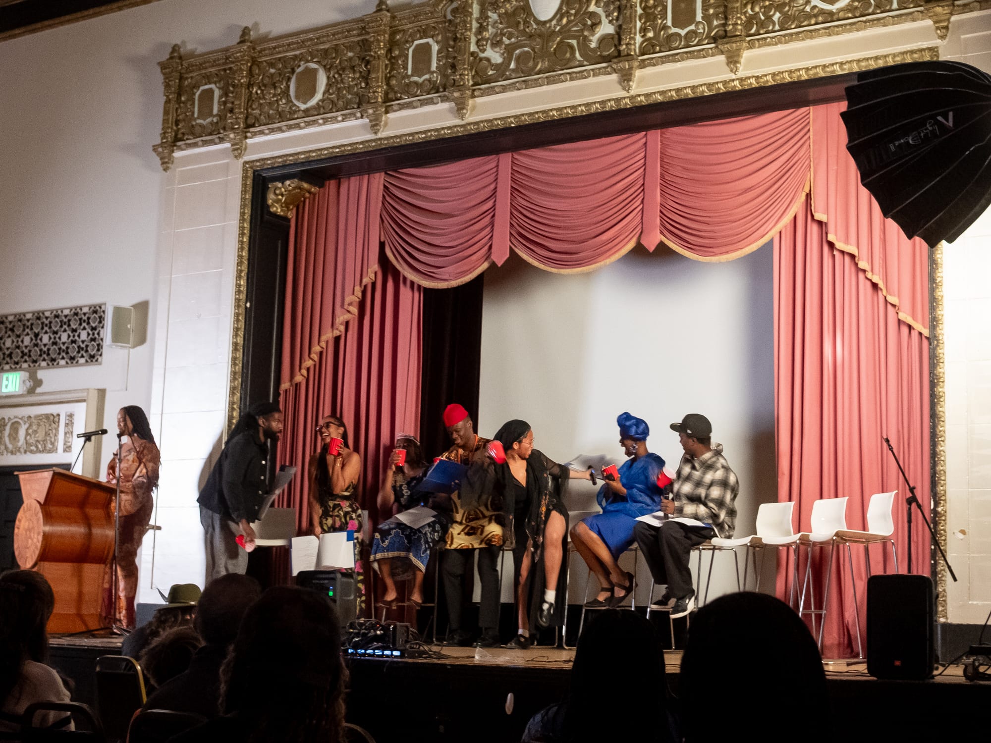 Dim light from yards-high blown-glass fixtures gently illuminate a large hall filled with stackable metal chairs. Two large umbrella lights stand on tall tripods, one stage left, the other on the carpeted floor below stage right. A line of white-seated low-backed stools, red solo cups beneath them, sit in front of white screen and a thick pink draped velvet curtain. A glossy podium stage right, mic’d, a director testing levels with the sound engineer at the foot of the stage. A handful of other writers and actors mill about, test hand-held mics, sing snippets of Bruno Mars’ “Grenade” quietly.