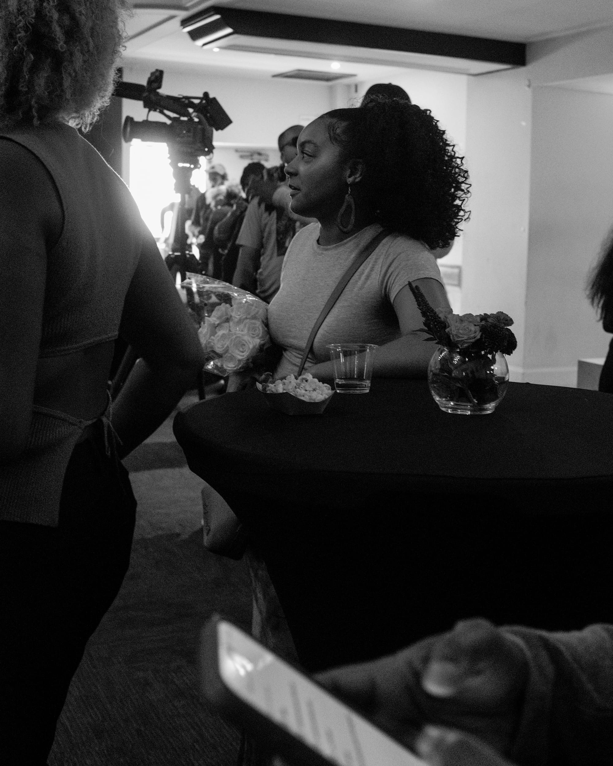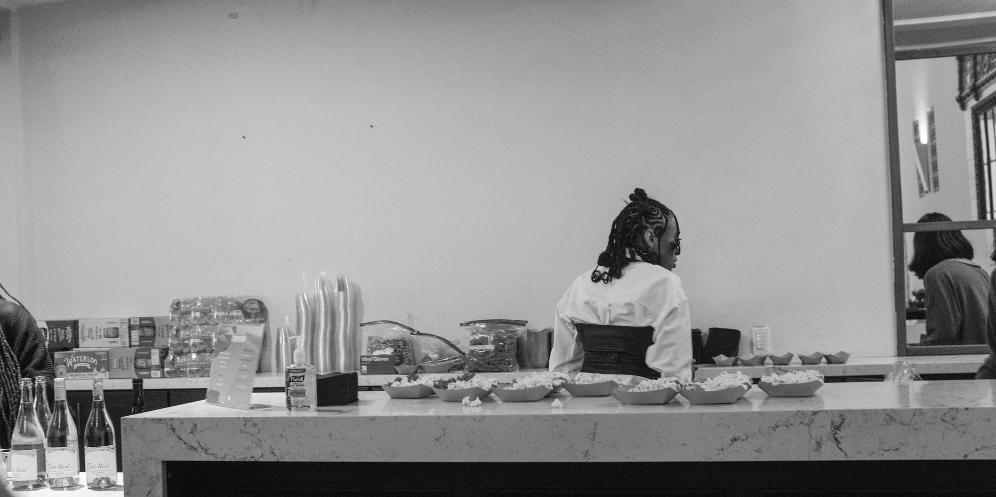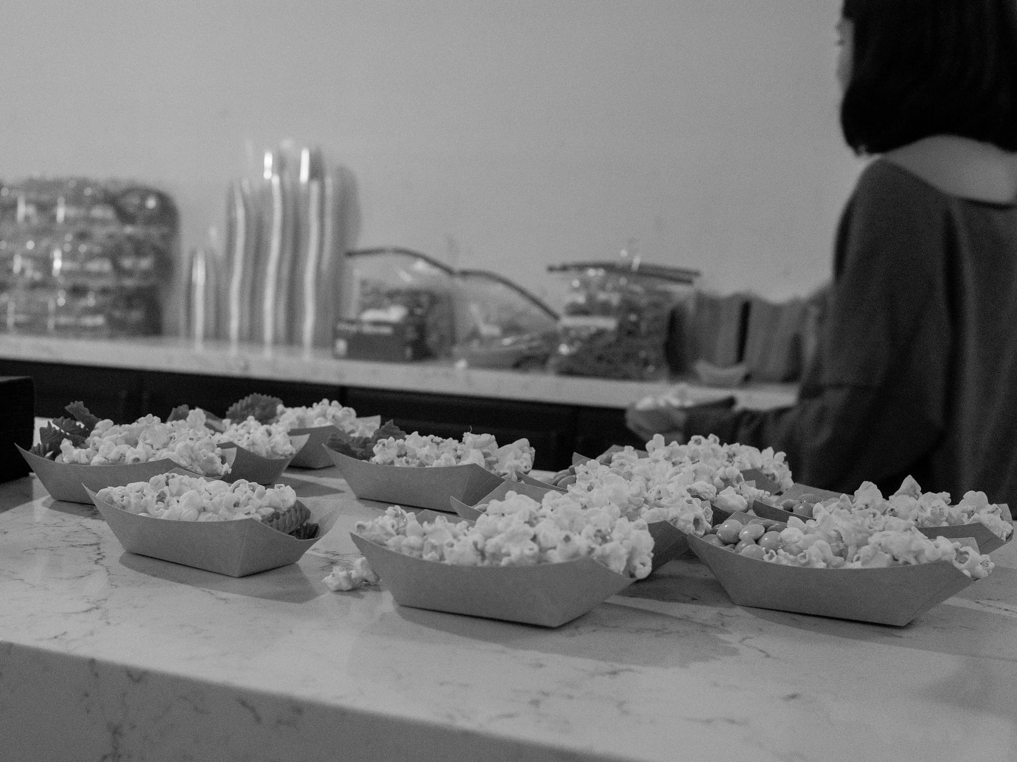 Attendees filter in, snag glasses of Cotê West wine and boats of popcorn and candy, take their seats.