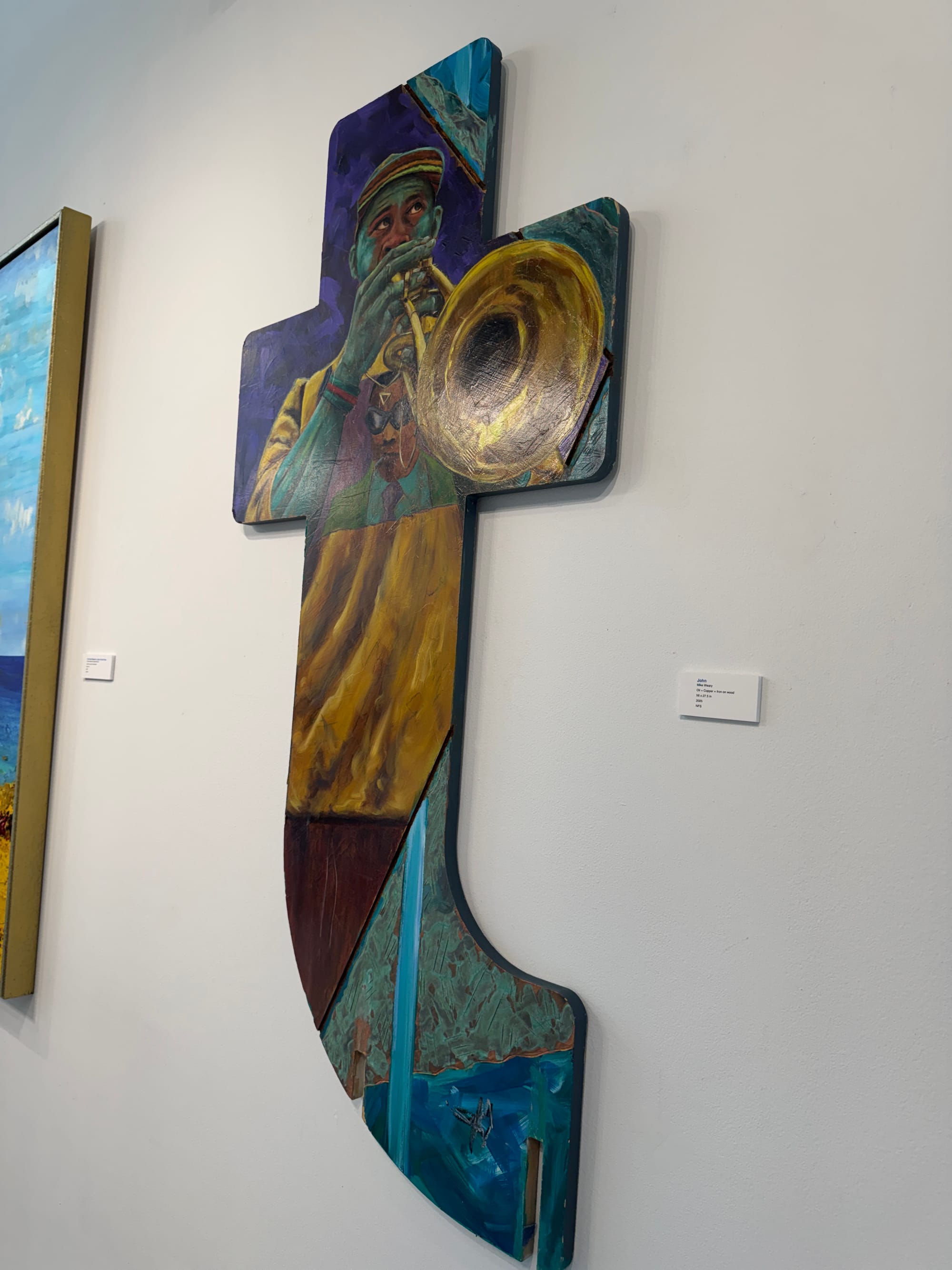 The exhibit is curated well. The pieces sing together and seem to bounce energy off of each other. One of Guichard’s pieces depicts a jazz band. Next to it, “A Seat in The Sound” (by Brandon Lewis) depicts a man playing the saxophone while sitting in a chair. It sits behind an actual chair (by Ashli Ognelodh Curry) which, while much more ornate, has the same silhouette. On the other side of the wall, “John” by Weary depicts a man playing the trumpet. While aesthetically distinct, the pieces seem to be in conversation with each other in terms of color because of the golden yellow hues used consistently throughout the exhibit. It’s like the pieces were made to sit together.