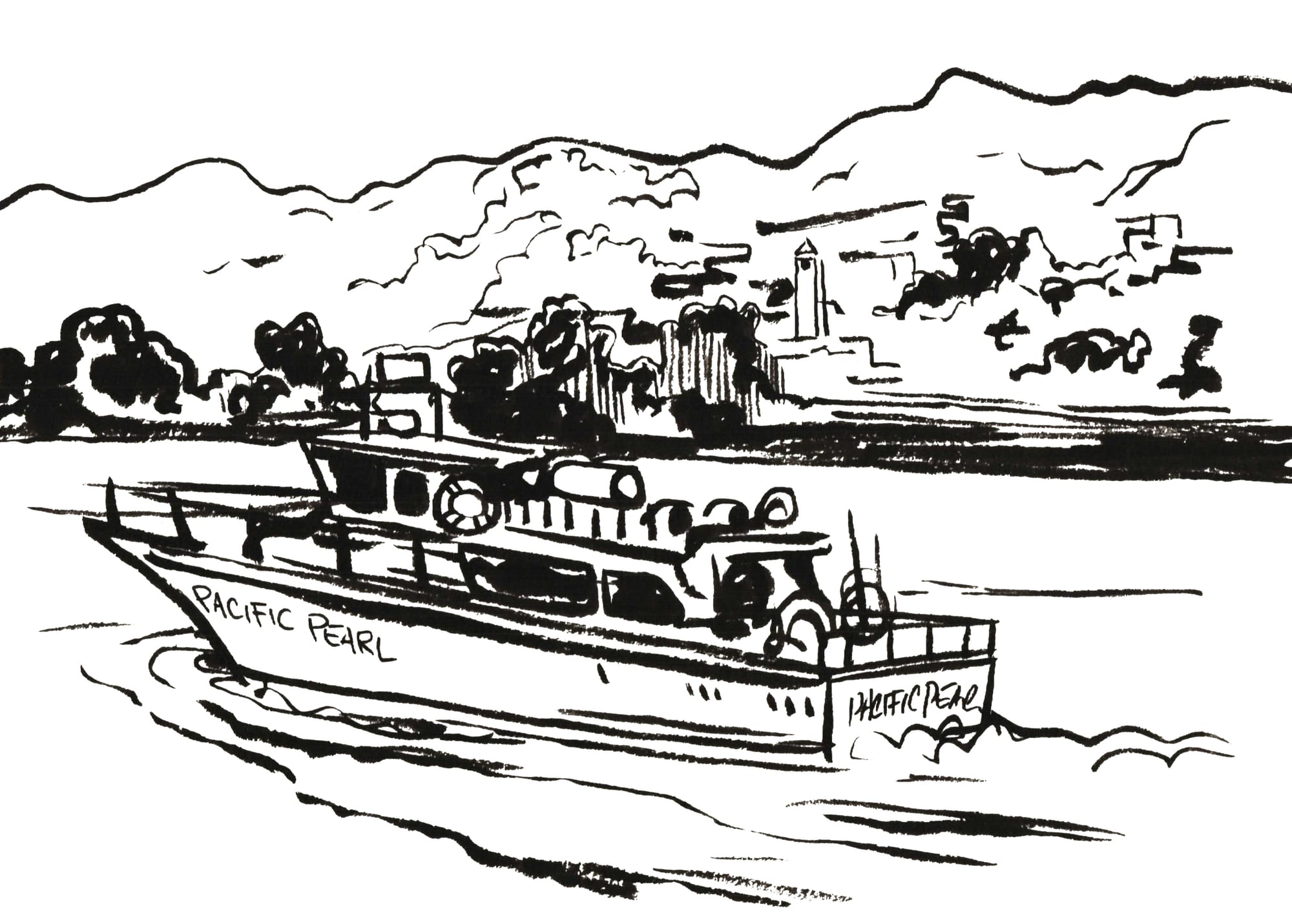 Our boat, the Pacific Pearl, set out from Emeryville Marina around 5. The trip was BYOB, so I pocketed a microbrew. Others came better supplied. The crew gave us our safety briefing and we sailed out of the marina. O’Donoghue painted a picture.