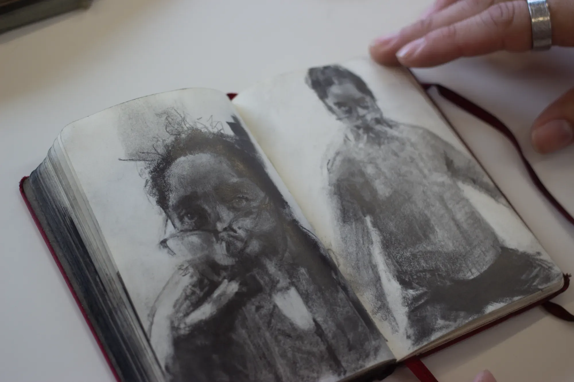 I caught up with Montoya a day after his 40th birthday, at his show Everyday Notes, the first-ever exhibit at new gallery Color Local in Erector Square in Fair Haven. On the walls were rows of his post-it creations. Super-thin white highlights cut through the dreamy fuzz of thick graphite strokes. A center table held a collection of Montoya’s sketchbooks, duct-taped and decorated with treasures like a “Way to go!” sticker given to him by his daughter, Raya.