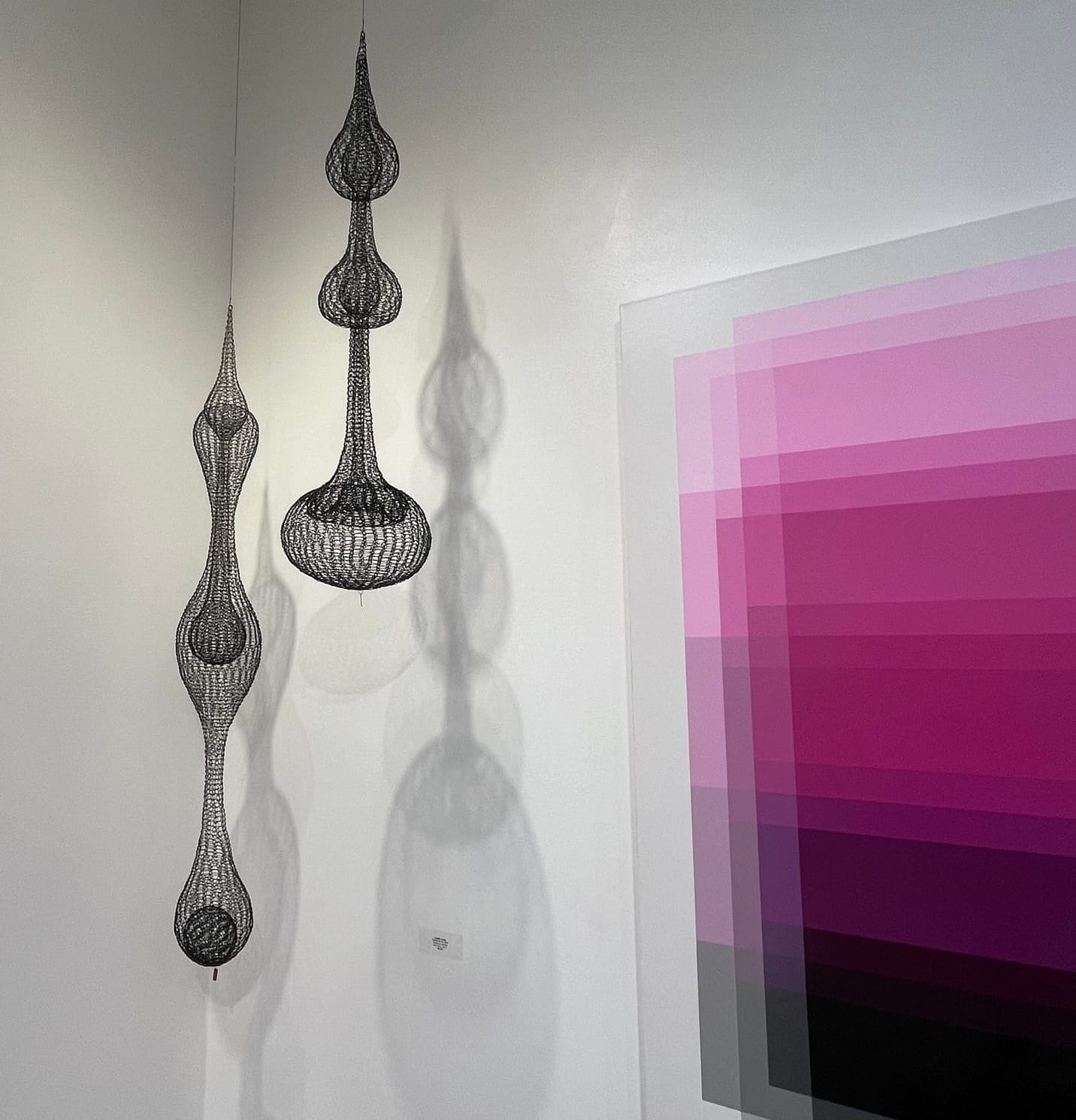 D’lisa Creager’s “0122-02,” 2021, and “0122-01,” 2022, hanging wire sculptures, augment Johal’s paintings, and the pairing held me in place for a long while. Made of copper wire with black patina and black wire respectively, the pieces are both interior and exterior, woven in such perfect complexity I couldn’t grasp how she’d crafted them. Although fashioned formalistically, Creager’s shapes remain organic-looking, juxtaposed with their elegantly ceremonial shapes. I was told by gallery associate Angie Garberina that Creager studied under famed sculptor Ruth Asawa’s daughter, Aiko Cuneo, and the influence is undeniably apparent. I found it an inspired curatorial decision to display Johal’s and Creager’s work alongside each other in a kind of geometric point-counterpoint.