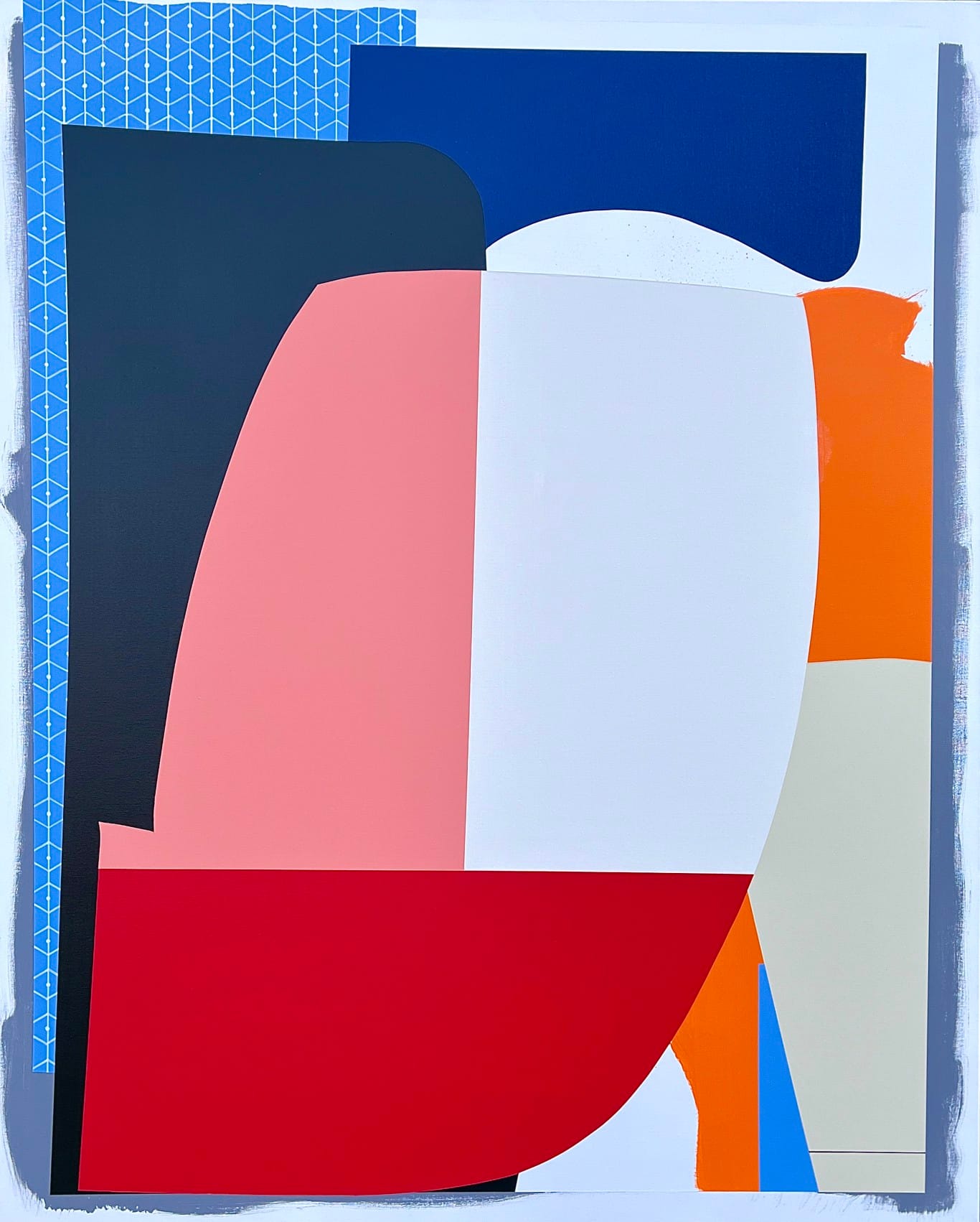 Eric Bohr’s “Frontiers 58” is a beautiful composition in red, pink, beige, and blue, with touches of orange. I was reminded a bit of the work of Kenneth Noland, even that of Frank Stella, but to be honest I rather prefer Kelly’s work better than either of those two giants of American abstract expressionism. Kelly’s work is less flashy, its color arrangements more thoughtful.
