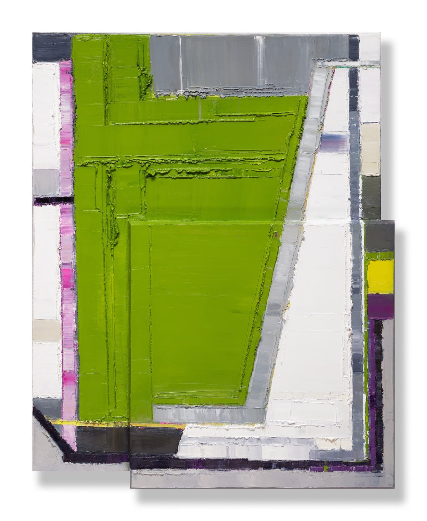 On the other side of the gallery were paintings by Maya Kabat: oil on shaped canvases. Her unusually shaped work was “chunky” by comparison to the other paintings in the show, but no less polished or accomplished. And their embrace of the thick oils she uses was a good contrast to the delicacy of the other works displayed. In “Super Spatial 19” the rough oil strokes of an almost insane green on its sort of bas-relief canvas was touch-for-the eye, so to speak. The equally strange shades of flat purple, pink, white and slate gray were a weird and wonderful combo. I loved them for the tactile quality, and really wished I could have touch it!