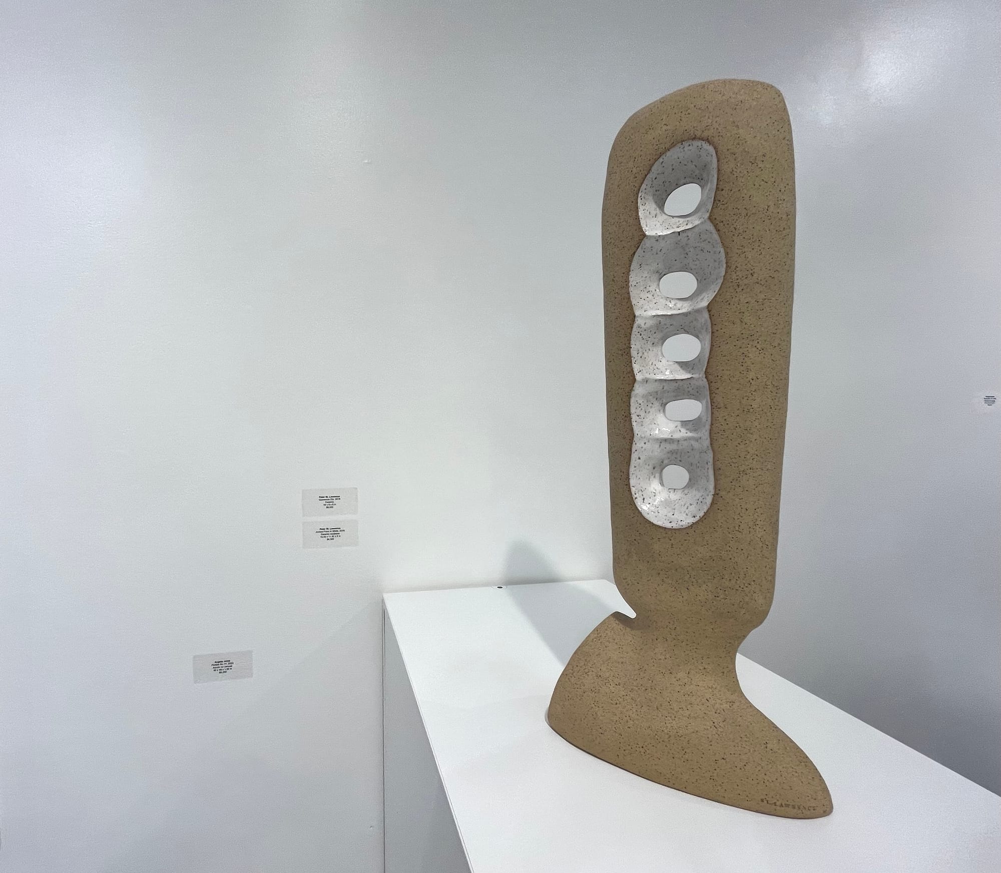 I did in fact, however, touch one of Peter St. Lawrence’s ceramic pieces (clandestinely, of course, just the lightest of a fingertip brush). I couldn’t resist the sandstone look of “Querencia Dia.” The sculpture’s interior portions is glazed in white, making for a delicious variation in friction. His mid-20th century Mexican modernist style pieces are lovely, recalling Rufino Tamayo’s work, but St. Lawrence’s sculptures are smoother, more abstract, quieter.
