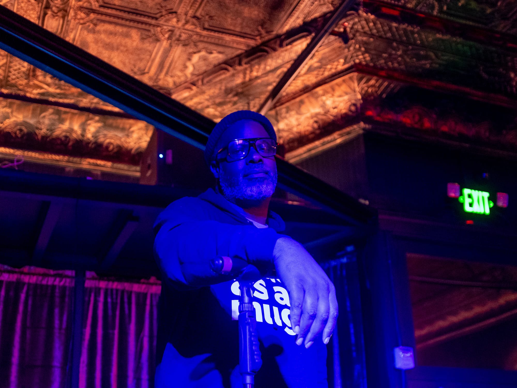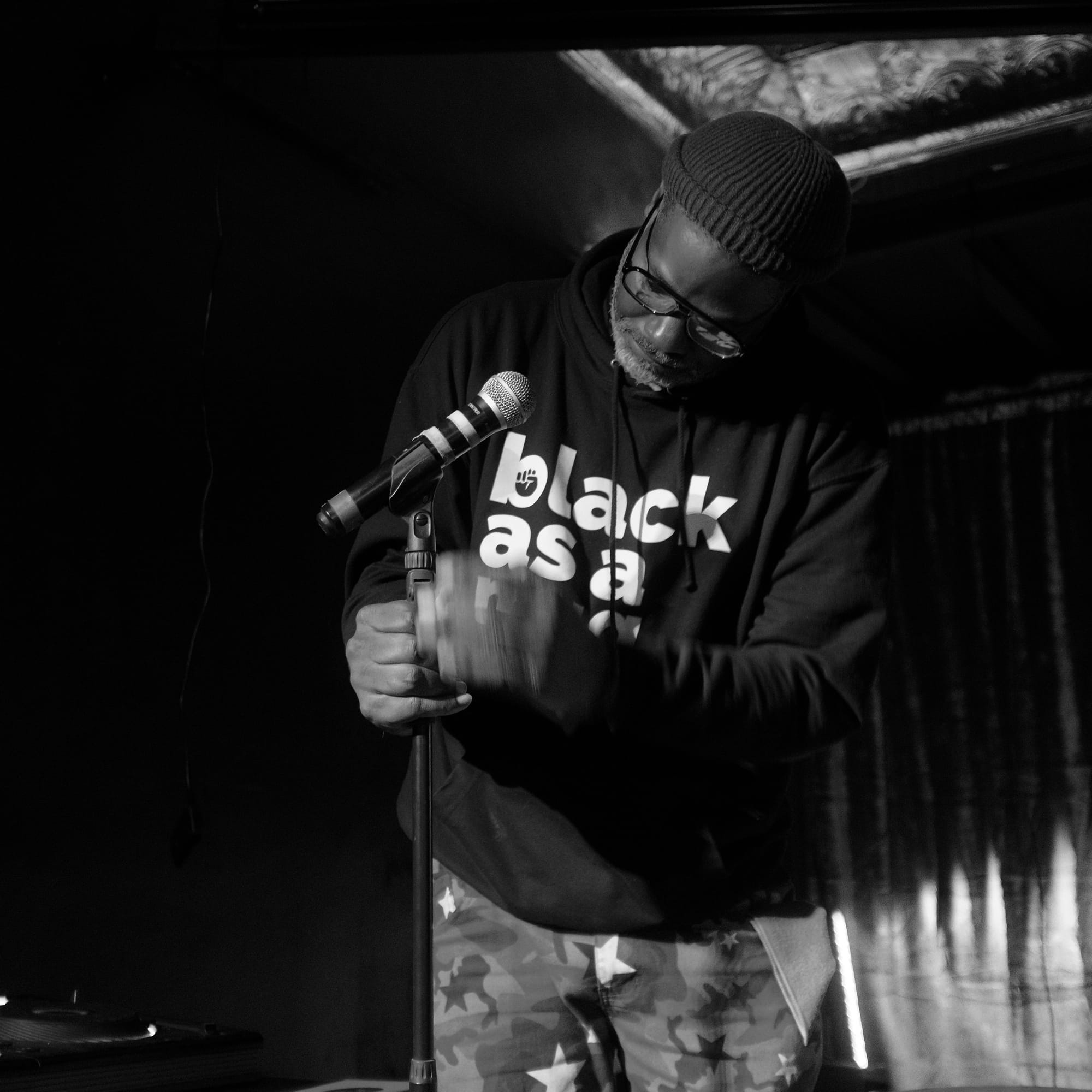 His easy presence made banter with the guests, even when calling some of us out. “I come from a part of Oakland where the gentrifiers are still scared to occupy,” he proudly stated, but also, “If you're a gentrifier, welcome,” each line punctuated by laughs and snaps. But, there were still lines drawn — “I don’t trust you if you say South Oakland.” Fair nuff.