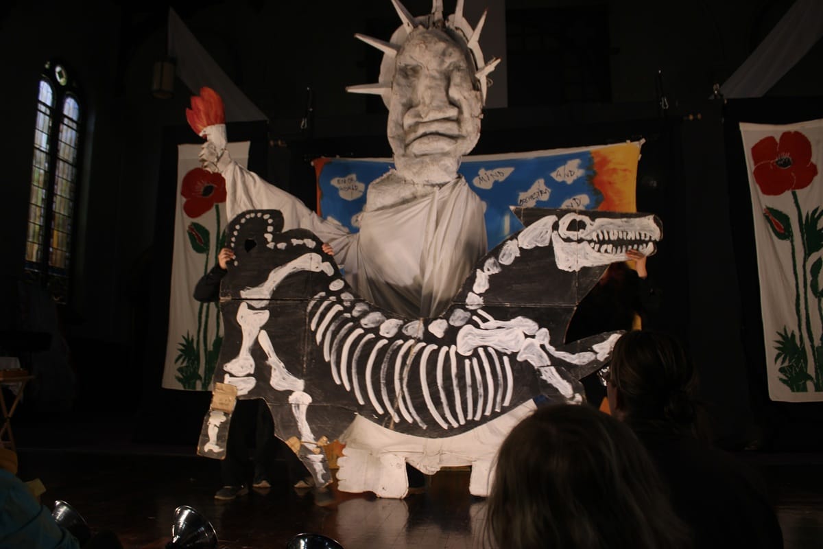First Presbyterian Church was such performance when it hosted Bread and Puppet Theater, a radical troupe hailing from their farm and home performance venue in Vermont. Their show, The End of the World Never Minding Show, carries on their tradition of political theater started when the group was founded in 1963.