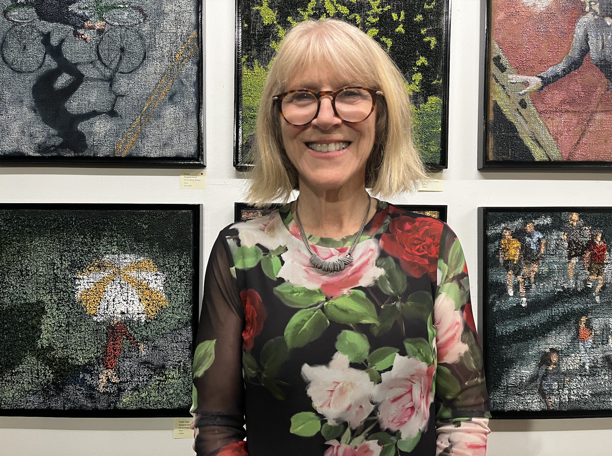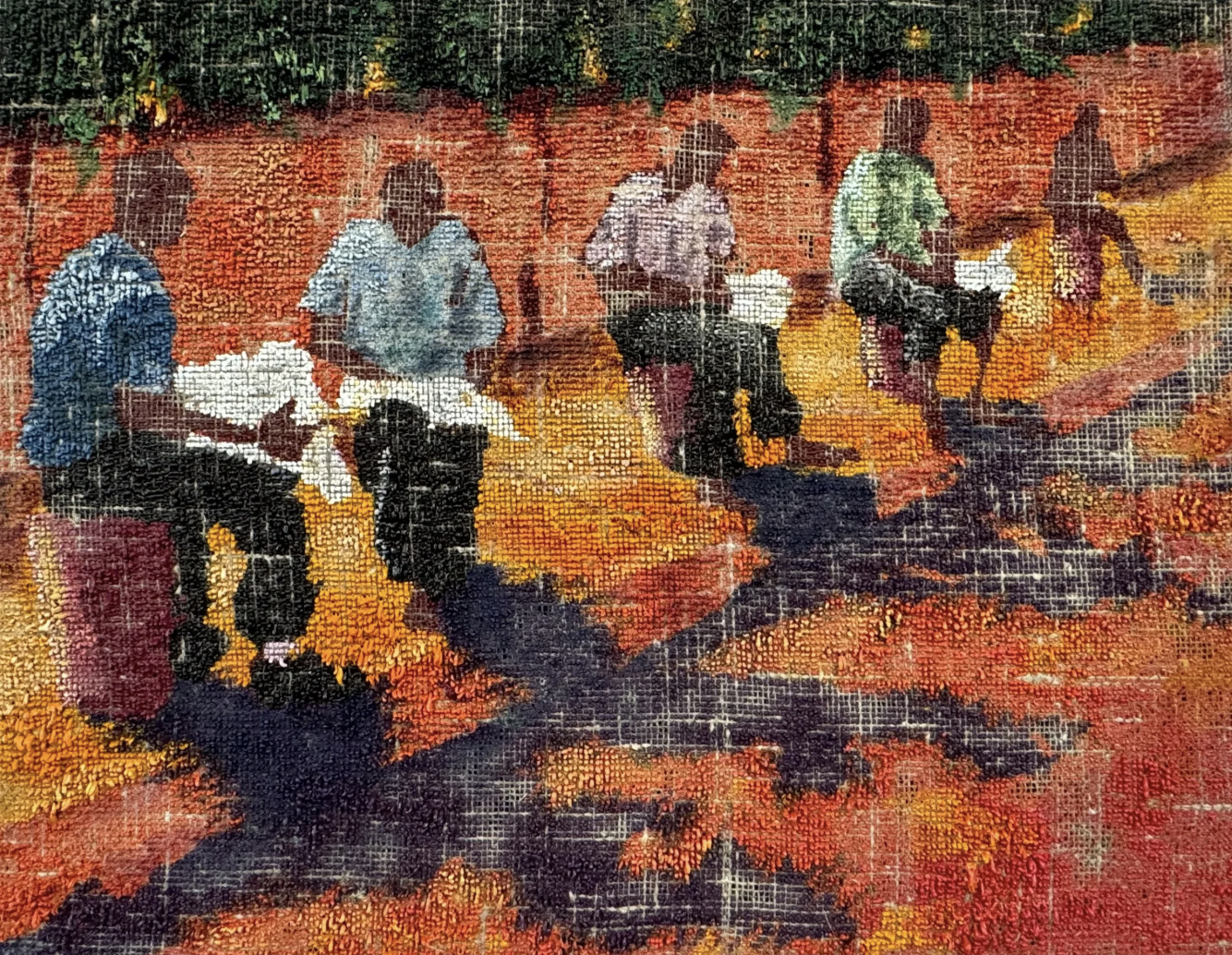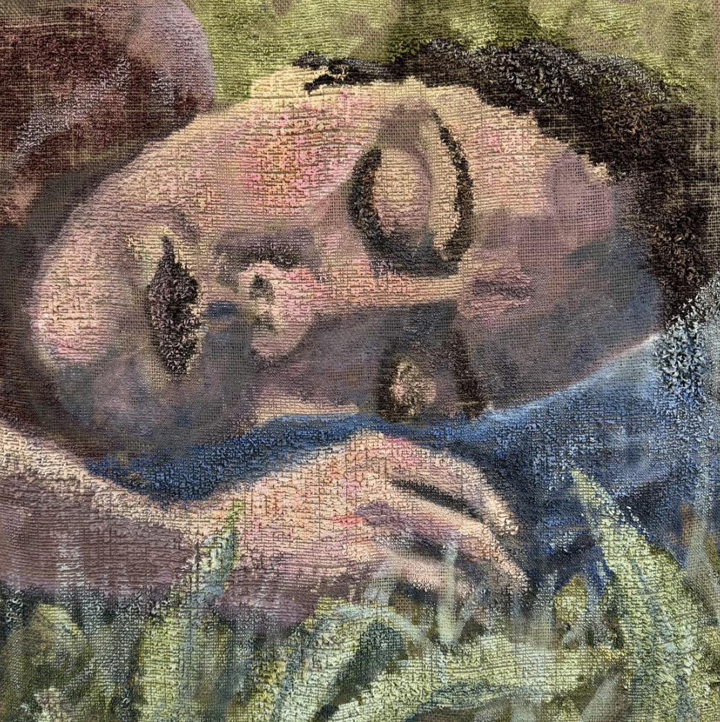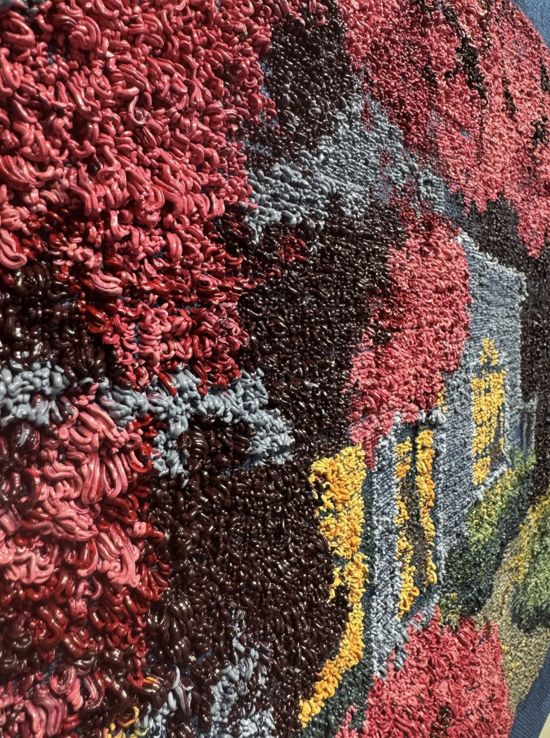 Koval’s scenes come across, from a distance, as intricate embroideries of modern life. But what look like loose threads are actually spools of pigment; the only fabric involved in the creative process is linen burlap, through which Koval pushes the paint in order to create a piled-on 3D effect. What was once plain cloth becomes a canvas, and the stolen image gradually develops into a dry mound of color.