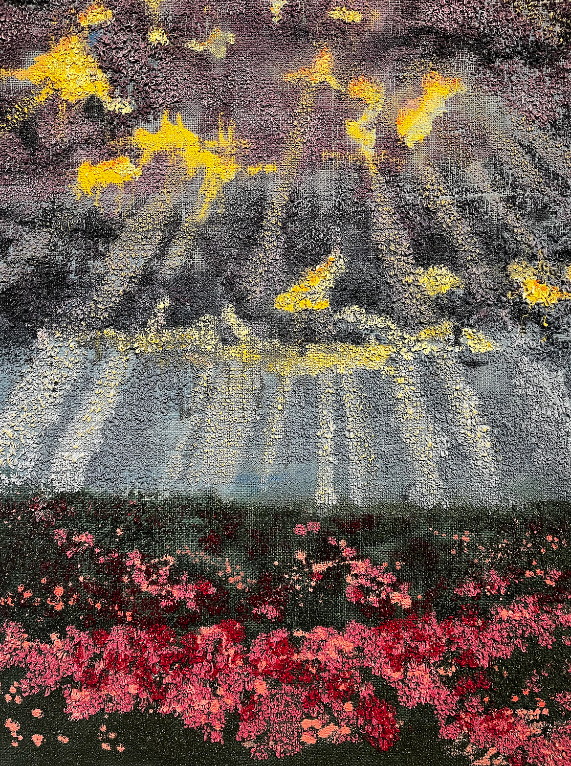 The paintings provide us the physical comfort of witnessing another person’s creative outlook. But if we stare too long we get taken down the deep road of low-resolution, where Koval’s burlap-pointillism can be compared to isolated building blocks like pixels or atoms, synonyms for emotive anonymity. There’s a latent trypophobia in the approach.