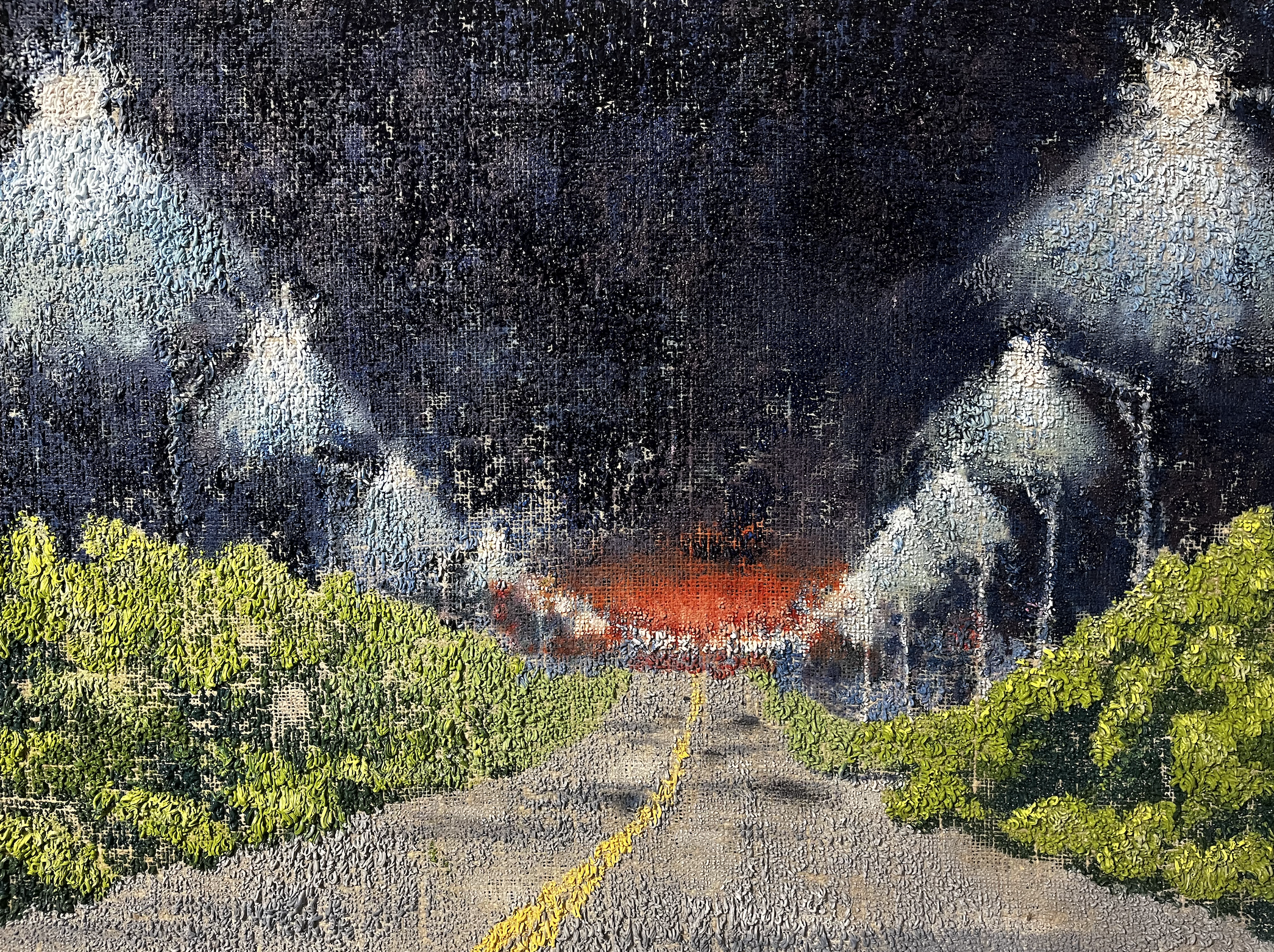 There’s an eeriness in the almost-human, but there’s also beauty in familiarity. Koval doesn’t necessarily show us a new way of seeing the world, but rather takes ownership over the absentee style of surveillance technology — using nothing more than some oil paints and burlap bags.