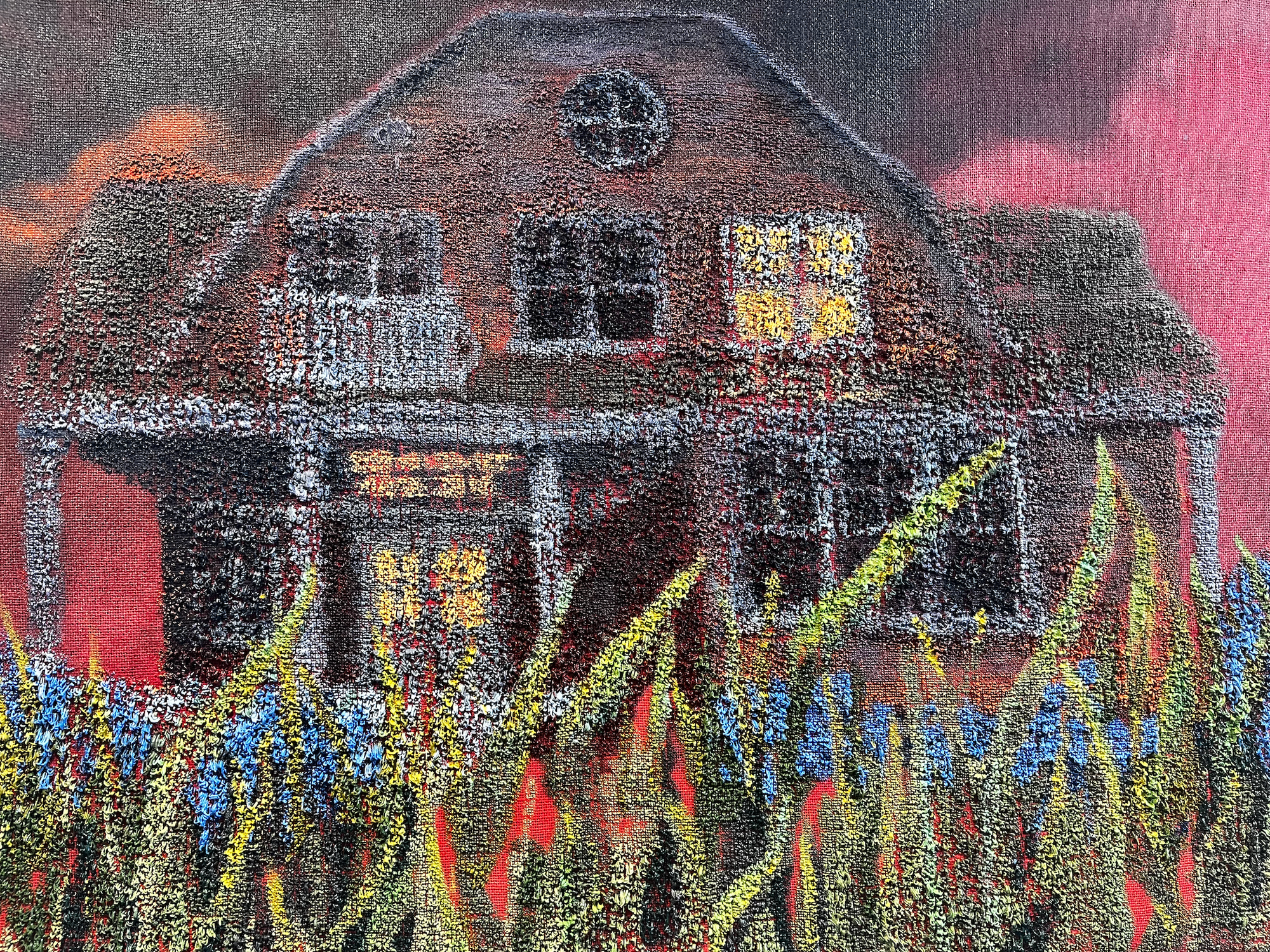 The closer you look, the more imperfect the picture appears. Take, for example, Koval’s depiction of a red house. At first, it looks like an ornate tapestry detailing a certain type of suburban grandiosity. Hours of labor must have gone into translating the delicate bloom of front yard hydrangeas. But face to face with the image, we’re met only with the illusion of intricacy. The reality is something closer to old paint peeling off the walls, revealing an inconsistency of shape and form that pushes us into a state of existentialism. The lawn at the foreground is conceptually transformed into a green wall of fire, and holes are poked (literally) into our ingrained devotion to domestic normalcy. Suddenly, we’re watching a pixelated rendering of a random home burst into flames.