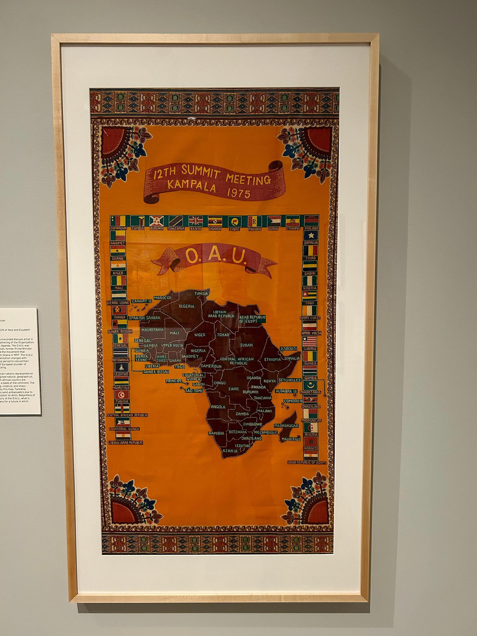 In “Uncharted Ways Through,” the viewer first encounters a juxtaposition of two French maps of early colonial Africa with a relatively recent (mostly) postcolonial map of Africa from a meeting of the Organization of African Unity in 1975. The joining of these images contrasts the perspectives of each map maker. The OAU map is presented on a poster for the event, whereas the French maps are situated among themselves.