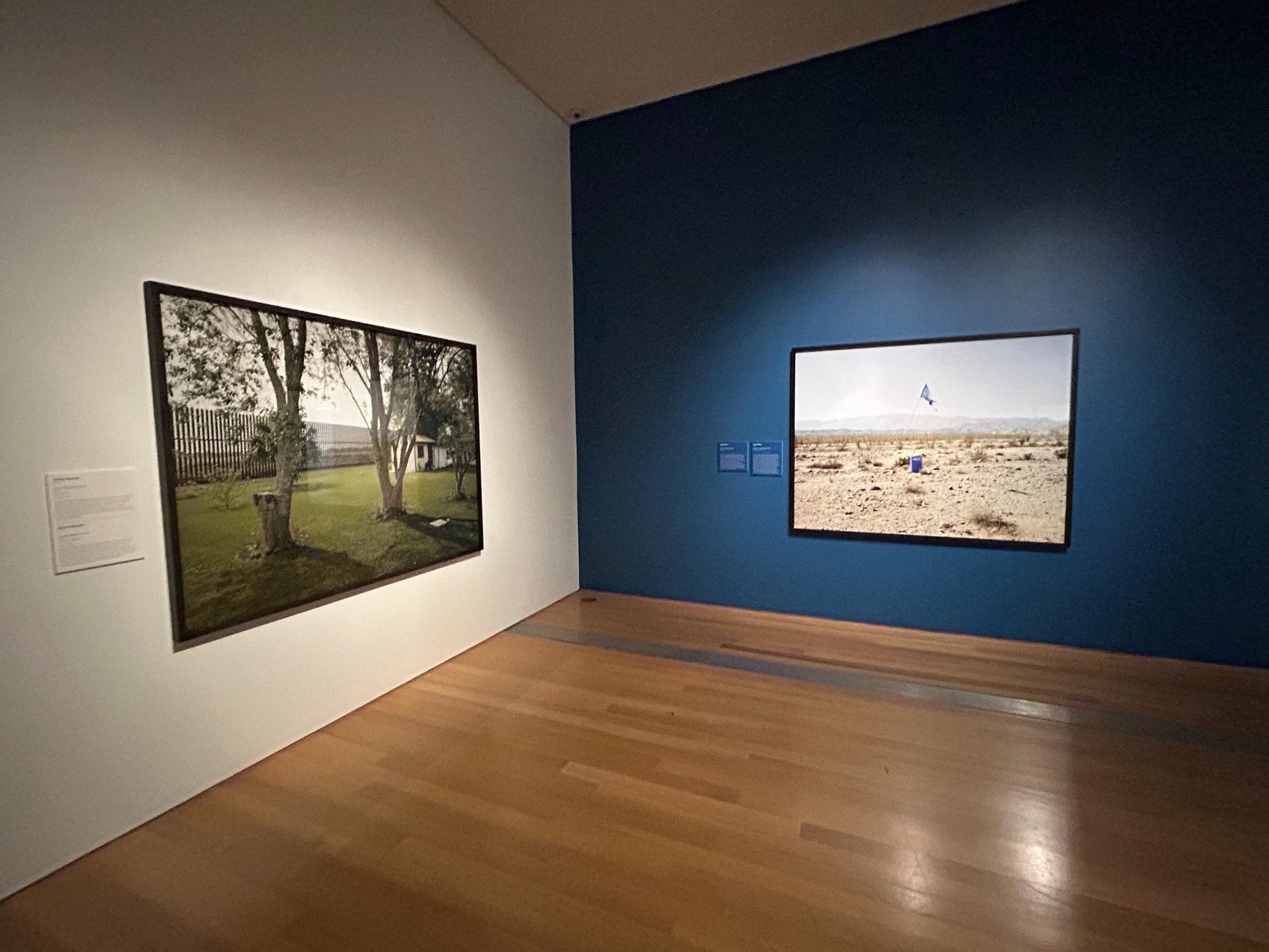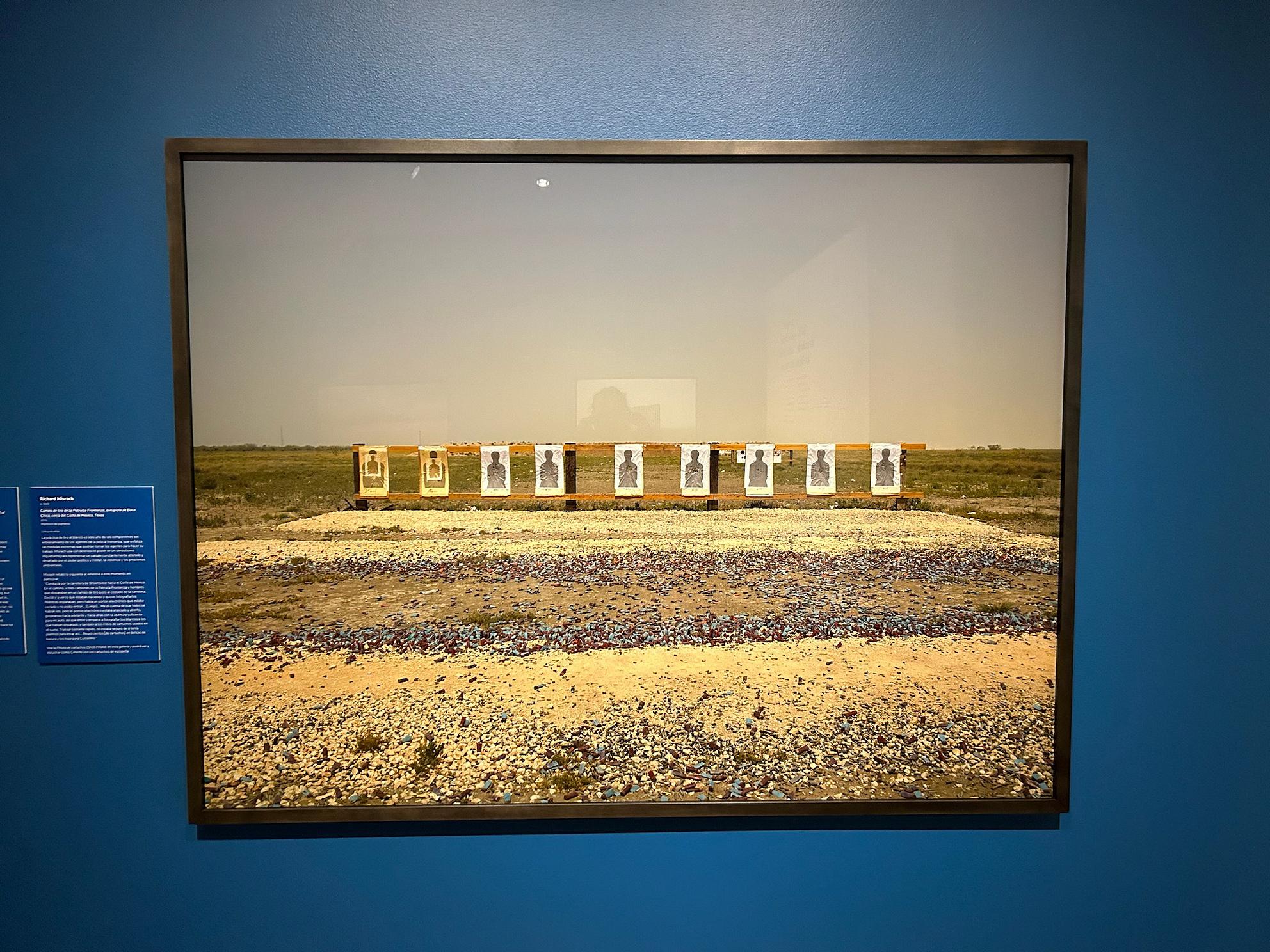 After the relative cartographic chaos, the orderly uniformity of “Border Cantos” — with a stark gallery of large-scale photos of borderlands between the U.S. and Mexico — proves a tone shift. Dusty roads vanish into perspective points, giving a zoomed-out sense to just how much the border wall disrupts the natural landscape. Some images are impersonal, others more foreboding; one such photo depicts a firing range and an ocean of spent shotgun shells.