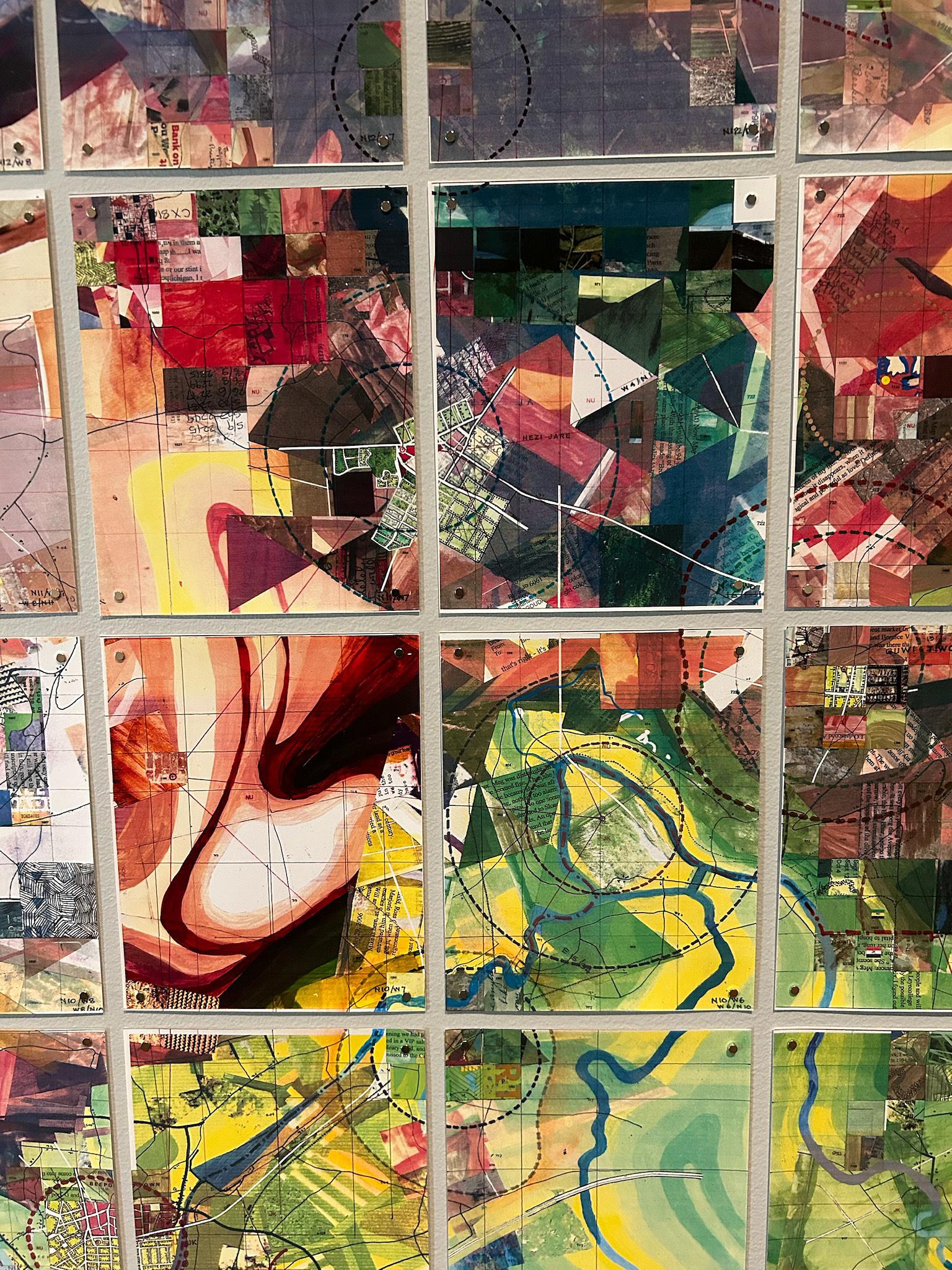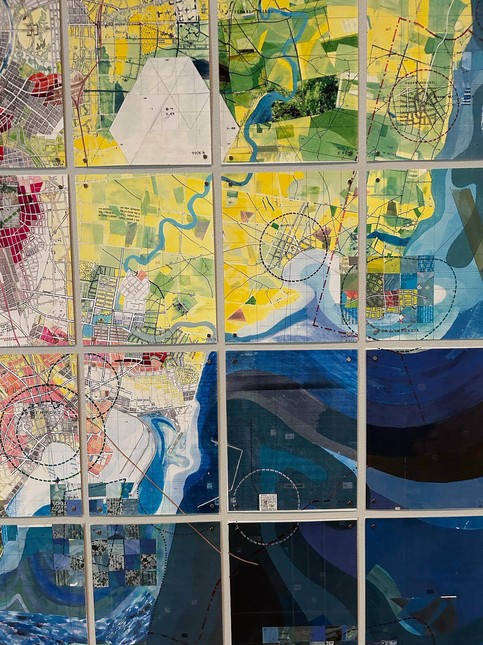 Engaged with the idea of place from hyper-local — the park out front — to abstracted maps and infographics, to maps as a blueprint in making art, “Uncharted Ways Through” manages to juxtapose an incredible variety of media and eras of artmaking in a relatively small gallery space. Its centerpiece, and in many ways the linchpin to the exhibition, is Jerry’s Map, an iterative collage and mixed media “map” of nothing that still bears the classic marks of cartography: clear borders, geographic features, even some elements of architectural drawing. On display is only a portion of the over 1,500-foot work, redone panel by panel to simulate urban growth. The effect is of bearing witness to an expansive cartographical grid to nowhere.