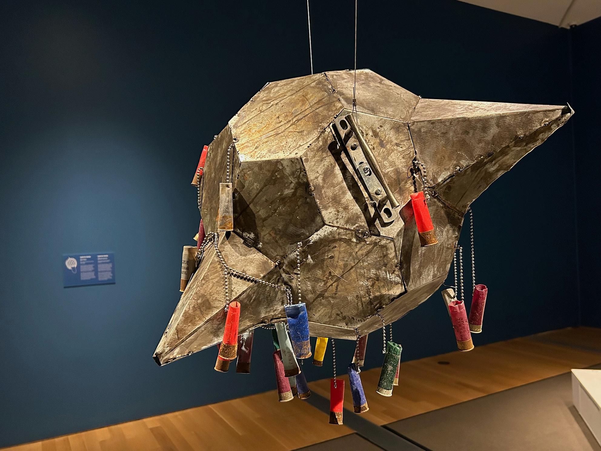 The second part of the exhibition, however, takes all that emptiness and turns it into a song full of the life that passes through the border. Many objects in the photographs, seemingly small among the vastness of the southern border, are brought to the fore remade as musical instruments. The second room of the gallery creates a composition in the round of art objects in the form of instruments: spent shotgun shells now adorn a piñata; a found “effigy” is strung with guitar strings, a cast-away bottle of Pedialyte becomes a pediaflute. Standing in the center, one can listen to a composition by Gallindo using all the instruments, a full 260 minutes long.