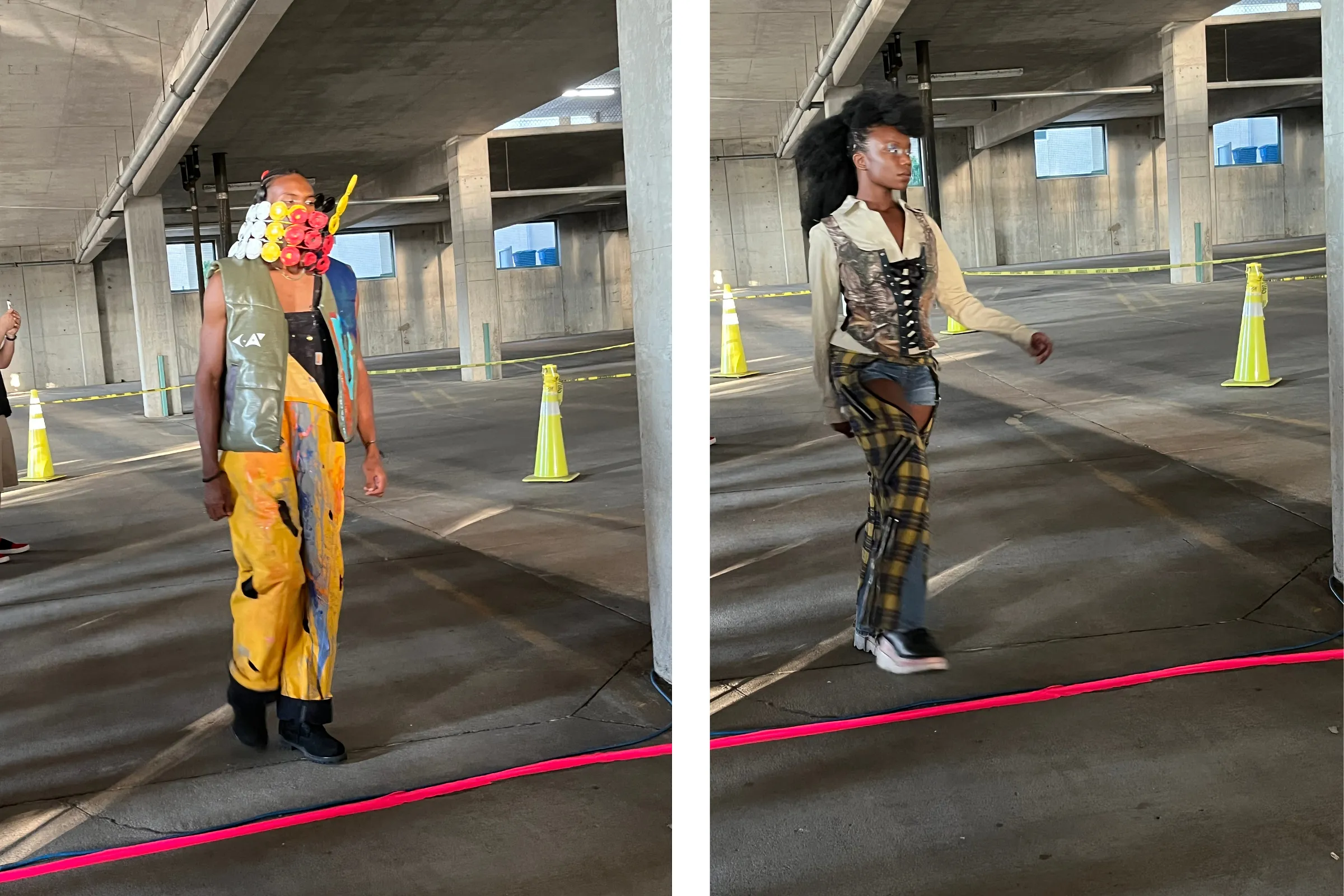 This couldn’t be further from the fashion enterprises you might have in mind when you hear “runway,” but that doesn’t mean it’s not tight as hell. These were garments whose upcycling and remixing brought “adaptive reuse” into sharp focus in this empty downtown space: A massive gorget made from painted bottle caps. A flotation vest dripping with paint, trailing a net stuffed with plastic scraps. Plaid pants trimly cut into ass-baring chaps with tiny jorts underneath and a corset on top. A sky-blue dress made from what looked like mesh fencing, rakishly wrapped in a Macy’s bag. At the bottom of a strong look in yellow, pink, and black, shoes wrapped in plastic bags, like you wear if you don’t have snow boots in the winter.