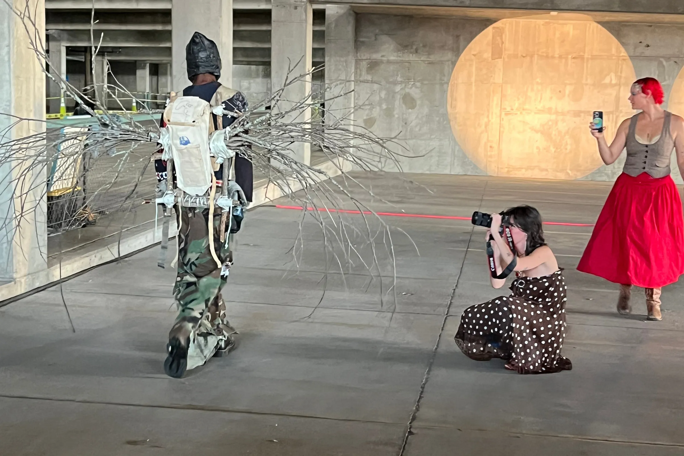 The mood of all these pieces was not so much “post-apocalyptic” as “emergent futurism.” It was vibrant and confident, neither despairing nor escapist but clear-eyed, collected, and joyfully defiant. Don’t underestimate anything that looks like it’s doing “nothing” — an empty parking garage, for instance, or a plastic bag, or an artist, or Gen Z itself. Reclaiming what’s underappreciated, under-utilized, and underground (whether people, materials or public spaces), these artists are turning the detritus of 20th century capitalism into instruments for the voices of a generation that’s looking to live, not just survive. Siloing off what’s trash from what’s treasure is no longer the move, is one way to read it. It’s about what we do with it all, how we compost it, how we walk in what we make with what we have.