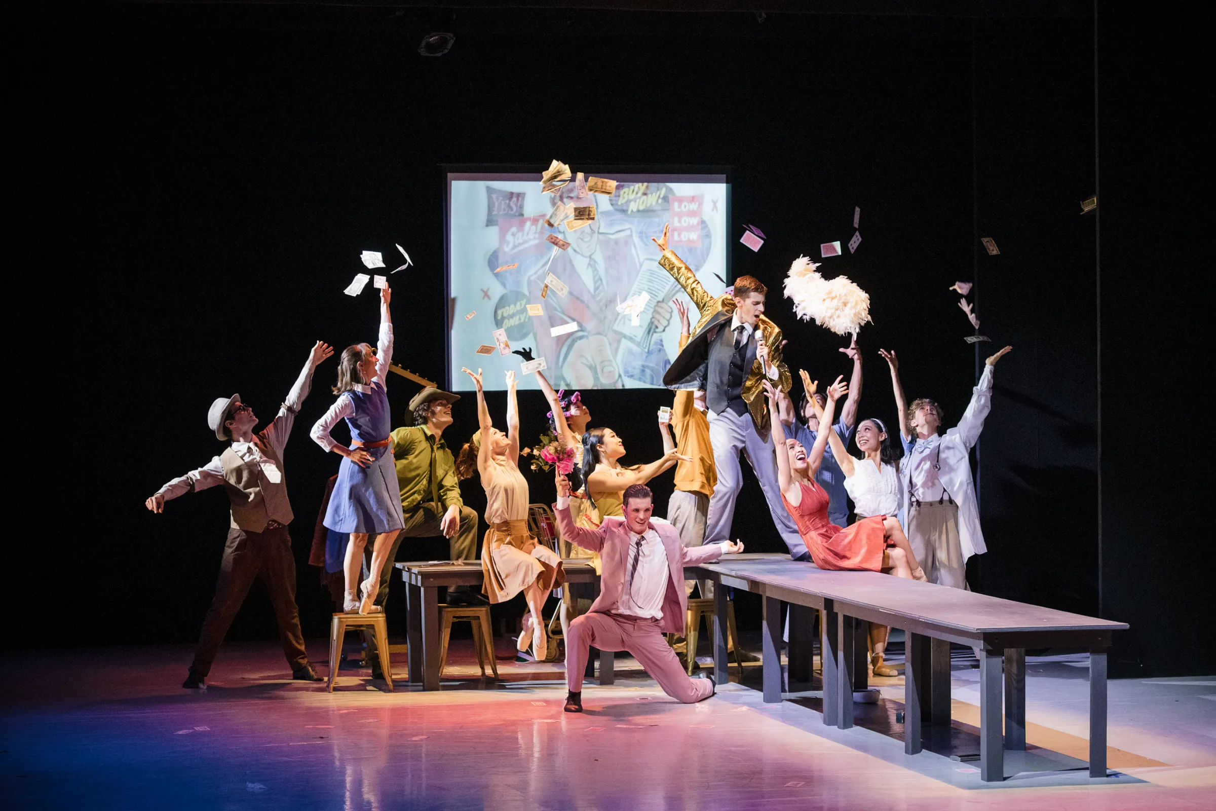 In the end, Saunders didn’t show us what we might have expected — one character breaking out from the pack, say, rallying the others to independence. Instead, she removed the urgency of all the ballyhoo for a few minutes, sending the whole ensemble into a slow-motion journey across the stage where we suddenly felt their human-ness. When they and the music wound back up to full speed, it was that soft slow-motion I remembered: the yearning to see and be seen outside the demanding, life-erasing gaze of everyone trying to sell you something.