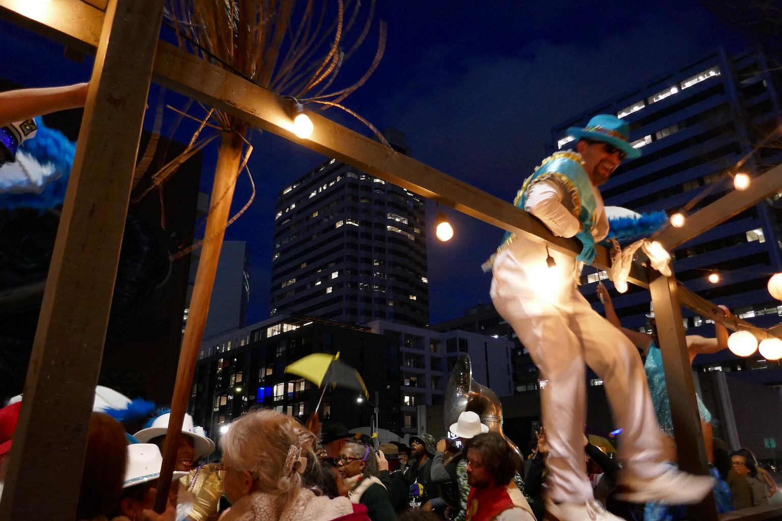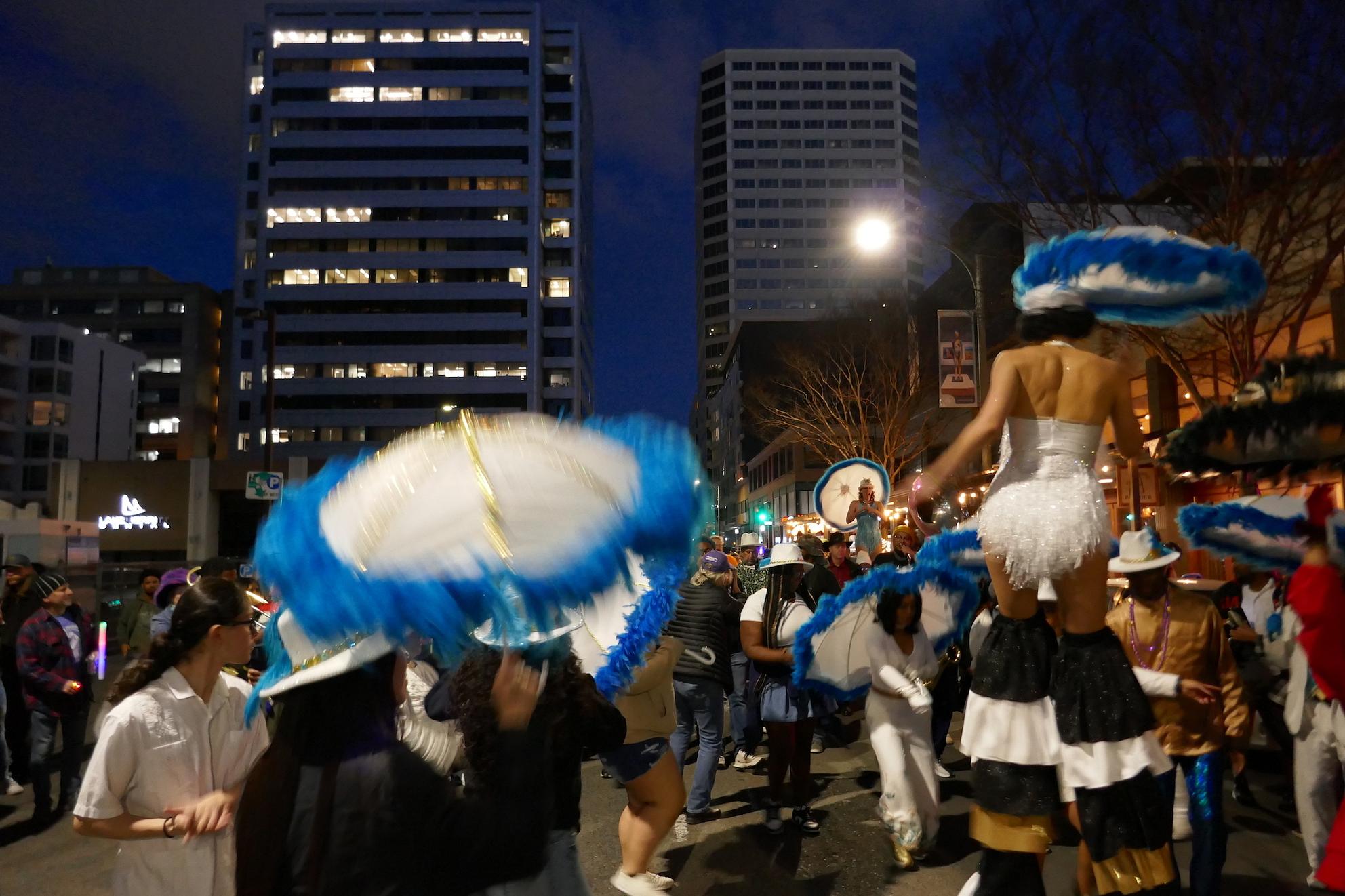 The Mardi Gras festivities in New Orleans can be a little overwhelming if you’re not prepared for it — the week of parades, parties, music, crowds, food, and good times can seem endless, the drunken revelry a bit too much. When I was there ten years ago, the people spilling constantly into and out of bars, restaurants, and Bourbon Street for days already began to wear thin after a couple of days. But celebrating Fat Tuesday in a hyper-focused, seemingly spontaneous parade for one night only on 19th Street, in a Bay Area town a couple thousand miles away from the Big Easy felt like the perfect amount of encapsulated joy — part Fellini film, all good times, a slice of a celebration that keeps you wanting more.