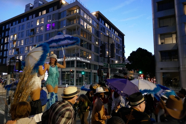 The parade started promptly at 6 p.m., with the Brass Boppers leading the way down 19th Street, away from Lake Merritt. If you’ve never listened to a New Orleans-style brass band play, you should catch this band. Having opened for acts like George Clinton & Funkadelic, the O’Jays, and other NOLA brass bands, they’re well-versed in inserting the bright, loud, raucous joy of that Big Easy atmosphere. It’s sort of like a high school drumline turned up to eleven and showered with Hurricane cocktails. I recognized the refrains of Destiny’s Child’s “Bootylicious” and the Beach Boys’ “Help Me Rhonda” filtered through a rolling band with drums, sax, and trombones. As we strolled down the street, spontaneous marchers broke out into dance and crowds spilled out of restaurants and bars to take pictures and cheer the hundred or so marchers on.