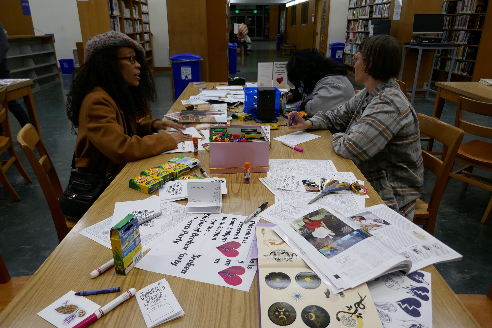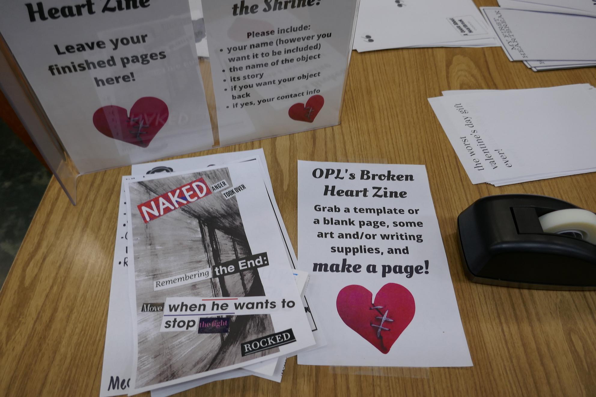 Sharon McKellar and Mana Tominaga, two librarians at the Oakland public library, had the same idea. Hearing about a “broken hearts shrine” from another librarian at a conference, Sharon convened the first iteration of the Broken Hearts Party at a bar across the street from the main library back in 2019. In subsequent years, they decided to expand its reach, and created a shrine at the library with contributions from patrons chronicling their own broken hearts. They also created a crafting party just before Valentine’s Day, where people can come together to write down their stories, contribute artifacts, or create a page to be added to the yearly “Broken Hearts” zine, now heading into its third issue.