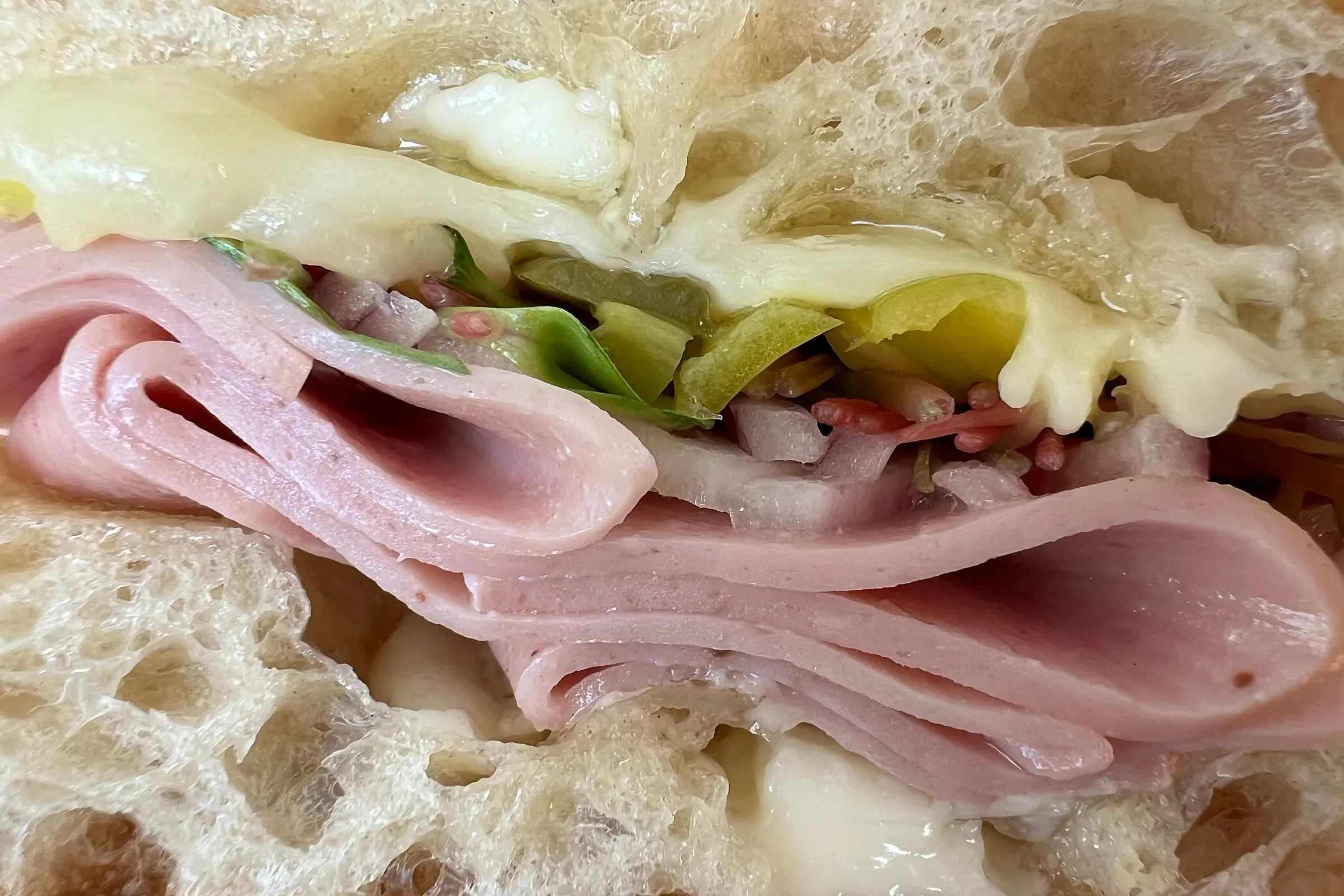 The mortadella sandwich, served on a baguette, had a generous amount of ruffled mortadella, cornichons, pepperoncini, raw onion, and microgreens, along with a healthy dose of fat and salt via melted cheese and aioli. The bread had perfect give and structure and held it together through the last bite. Each component eaten separately was just sort of what you’d expect, some salty and some bland, some greasy and some fresh. But ratios, quantities, physical assemblage? Spot-on. No sides come with these sandwiches; they don’t need them.