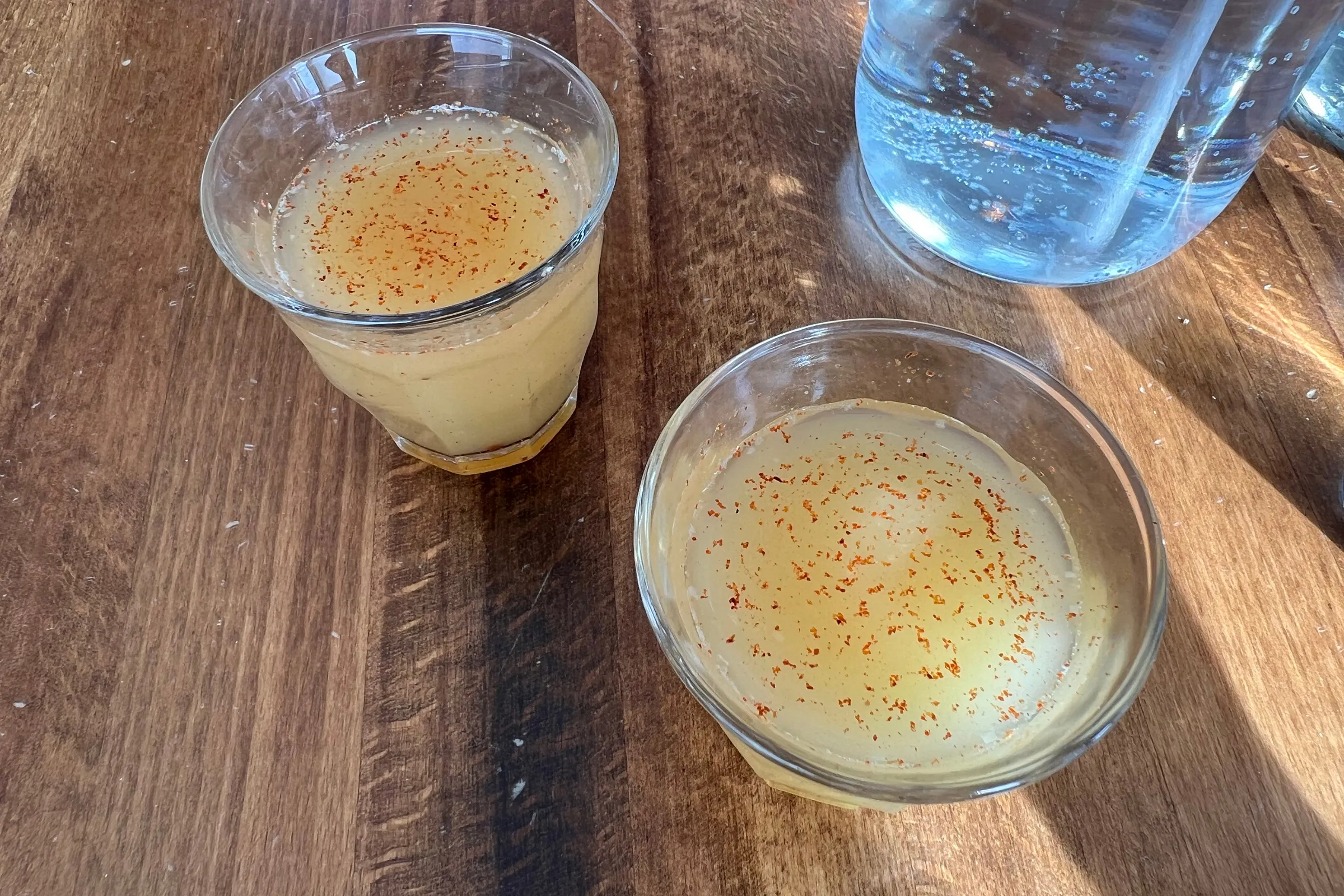 As such, we started with the ginger shot “fully dressed,” a combo of ginger juice, maple syrup, and cayenne, a common wellness tonic that tasted better here than other places I’ve had it, thanks to a generous syrup-to-ginger ratio.