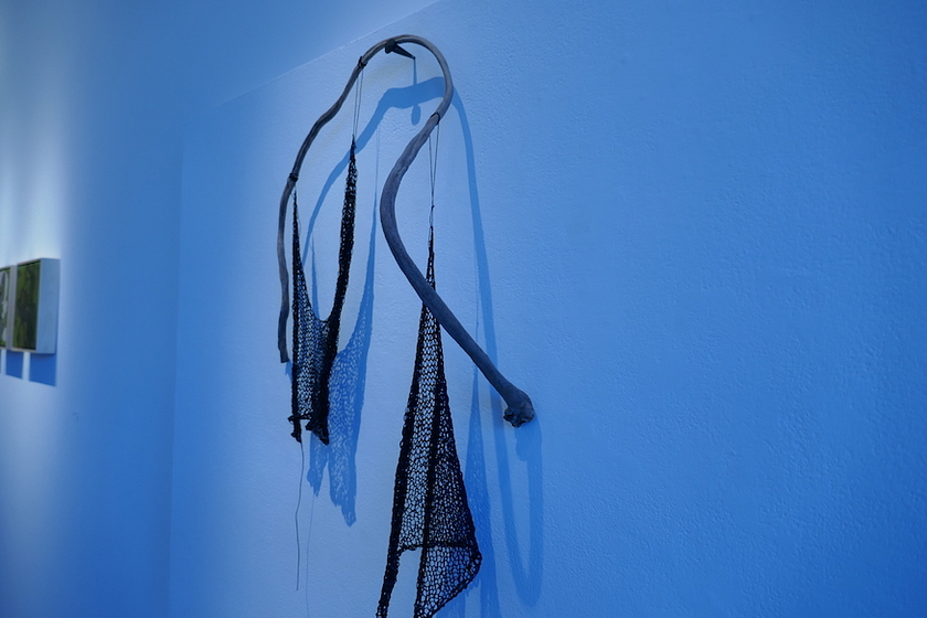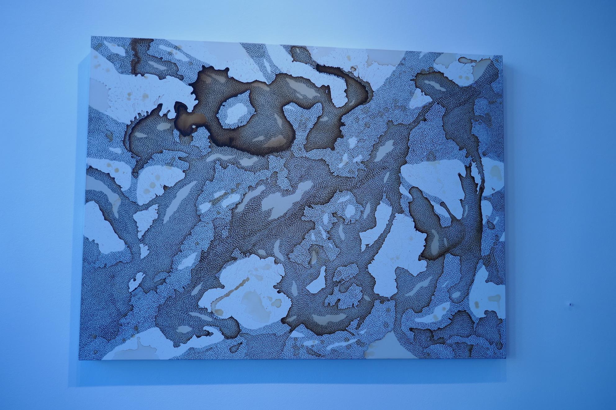 Flow, Monika Mayer’s exhibit, showcased some captivating conundrums. She began working on canvas with coffee, ink, and stitching, creating pieces that look like three dimensional works flattened into two, and blown up from a cellular level. Organic splotches of browns and blacks from far away were, upon examination, made up of delicate, skin-like threads that look like what you might find under a microscope. Then there were the actual three-dimensional pieces, made with materials like inner tube linings and plastic. These were hung from the front window or from hooks on walls, or thrown on mannequin torsos like a widely thatched second skin. I watched a lot of guests stepping forward and away from some of her pieces, exploring the same questions I had. Trying to understand the make-up of her pieces from different angles, working out in my mind how they came to be, I unconsciously mirrored the themes she meant to explore, of “identity, connectedness, and a sense of place.” What a neat trick, I thought.