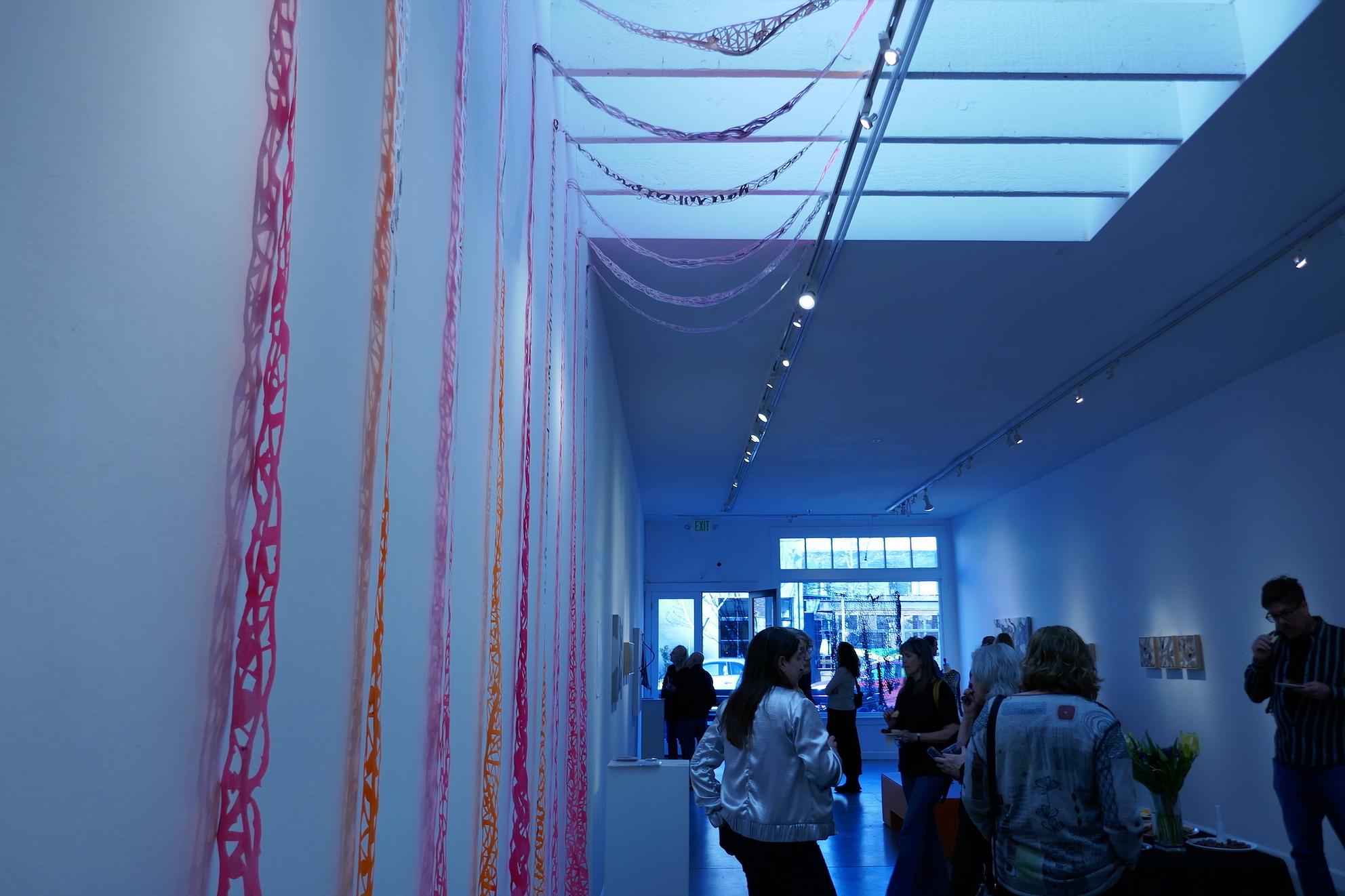Korican also hung parallel strips of fabric that hung down from the skylight in the gallery, punched through with lacy patterns and colored with pink and orange on both sides, with words forming sense poems as the eye gazed up and down — a jumble of color, text, and texture. I’ve read about the mind forming neural pathways of ways of thinking, of memories and thoughts we may go over a million times in a day. This felt like a snapshot of that process, blown up to life size, forcing us to reckon with and respect it.