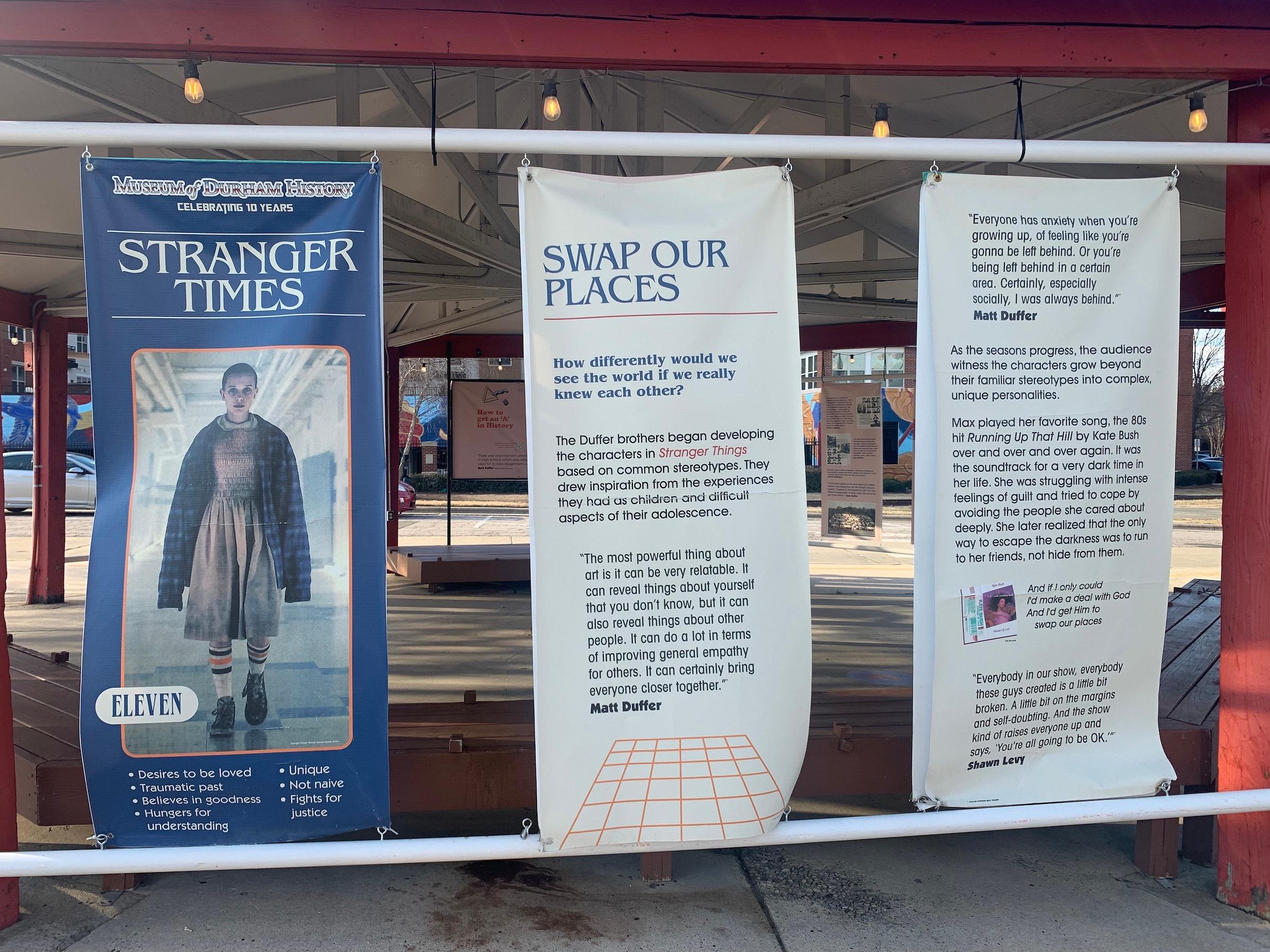 The other side of the panels describes the Duffer Brother’s upbringing. They attended public schools, fell in love with movies at the Carolina Theater, a community staple, and visited Wilmington, where they visited a film set for the first time to see a taping of the critically acclaimed teen drama, Dawson’s Creek. The entire display provides a glimpse into their North Carolina ties and is best visited on warmer days.