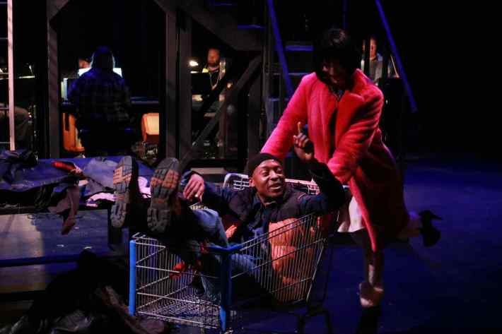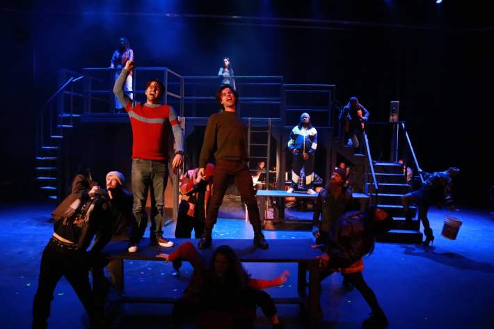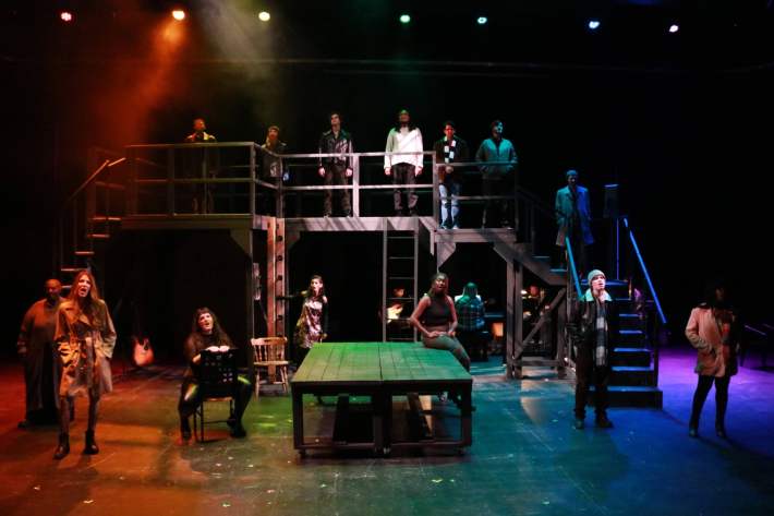 RENT is very angsty, a mood amplified by its rock-opera style. Theatre Tulsa’s production design doubled down on this aesthetic. A black-painted, two-story set resembled a fire escape. The ensemble moved two large tables into several configurations throughout the show to make a door, a stage, and a long table (and runway) for one of the more well-known songs, “La Vie Boheme.” For most of the production, lighting designer Chris Porcelli kept the stage quite dark, especially in the scenes where Roger and Mark’s apartment loses power. During the songs, he found spots for fun effects to boost the feeling: roving spotlights during “Rent,” an electrical pole lit to look like a Christmas tree during act one, and a beautiful rainbow spectrum for the song “Seasons of Love.” Add a live, five-piece band on stage and it was impossible to escape from these characters’ big emotions.