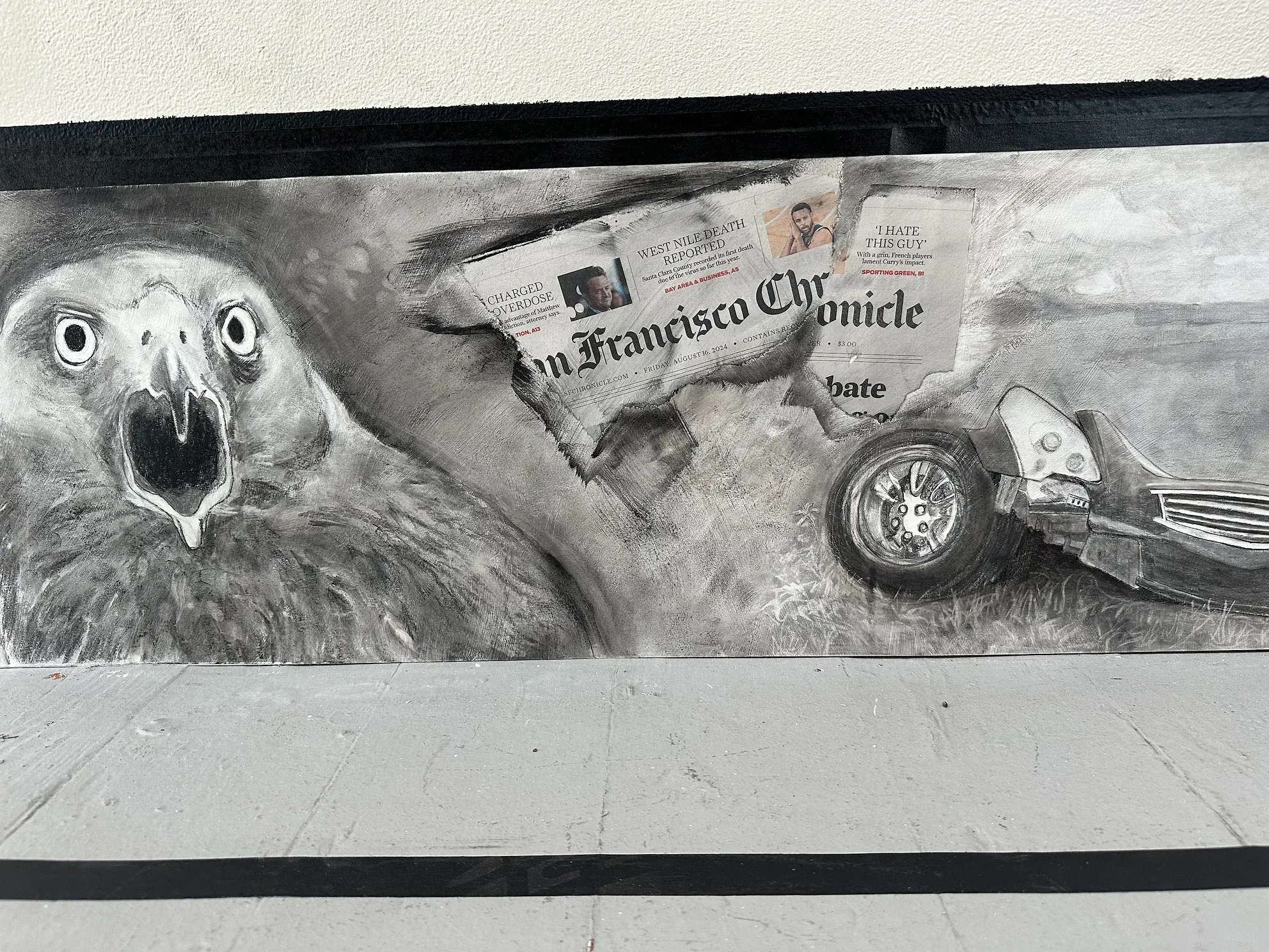 As I made my way through the enormous group of New College alumni and young artists, I spotted the work of Meredith Tromble. Tromble’s art is as varied as it is delightful. Multi-media installations adorn two walls. A Mesmerizing video piece showing a figure dancing across space and color pairs nicely with the mural of a hawk, seemingly in mid-screech as newspapers fly around its head. It is Tromble who catalyzed (not curated) the show. An alumna of New College with an MFA from Mills, Tromble then became a professor at the San Francisco Art Institute. She believes that this trifecta of schools that have failed or merged over the last fifteen years has left a creative silence in the Bay.