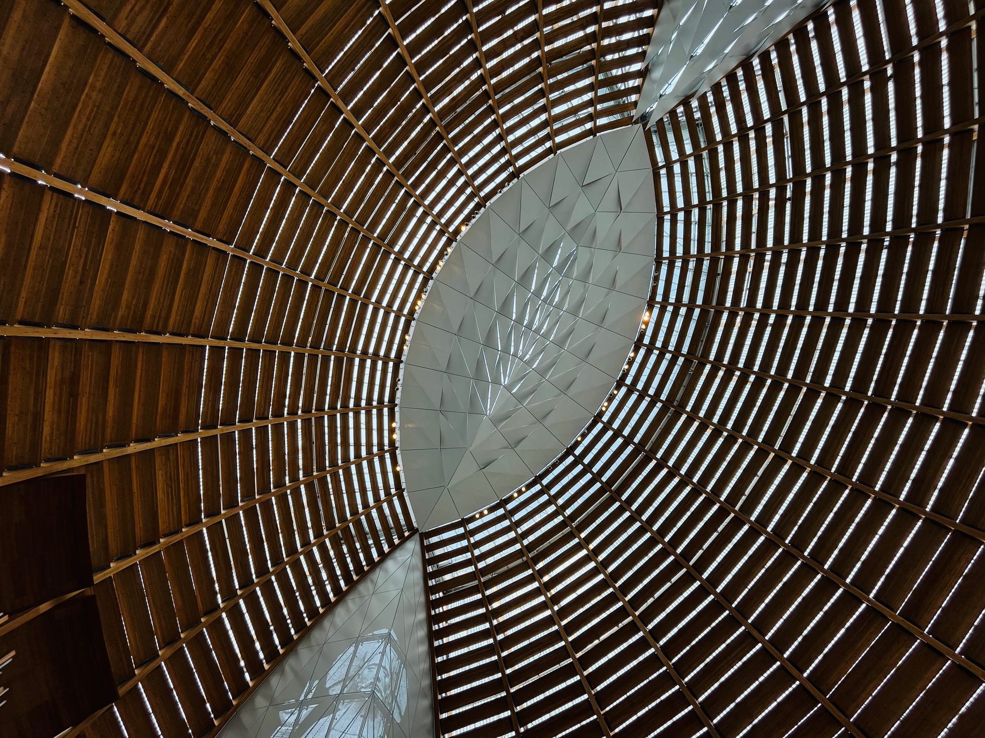 A 58-foot-high figure of Christ, based on a Romanesque façade of Chartres Cathedral and composed of 94,000 laser-cut perforations on aluminum panels, greets entrants, light piercing through. Light also filters gently in through the glass, mitigated by slatted, curving wood lattice walls over correspondingly semicircular pews; and through the overhead Vesica Piscis, Latin for “fish’s bladder.”