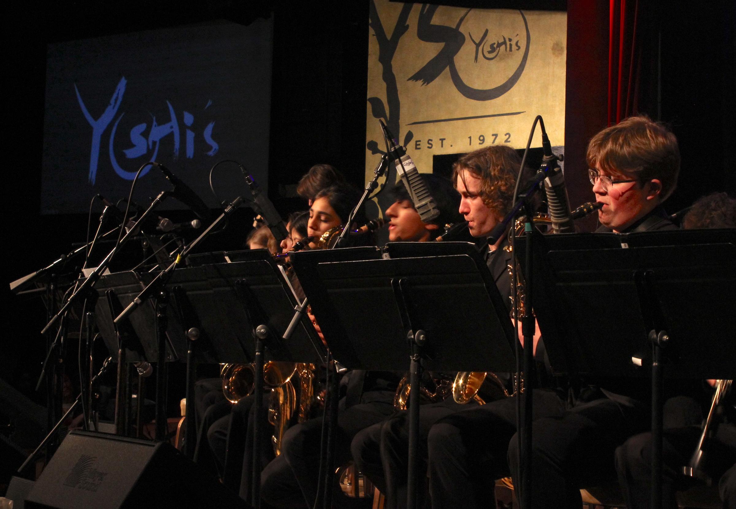 The black and white blown-up photos of jazz prophets such as Wynton Marsalis and Poncho Sanchez hung along the walls, and acoustic panels were positioned along the curve of the back. I was reminded from the “est. 1972” painted on the walls that this has been a landmark institution for the purveyors of jazz for over 50 years and how special it is that the high school jazz band can come across town and perform on the same stage as the legends before them.