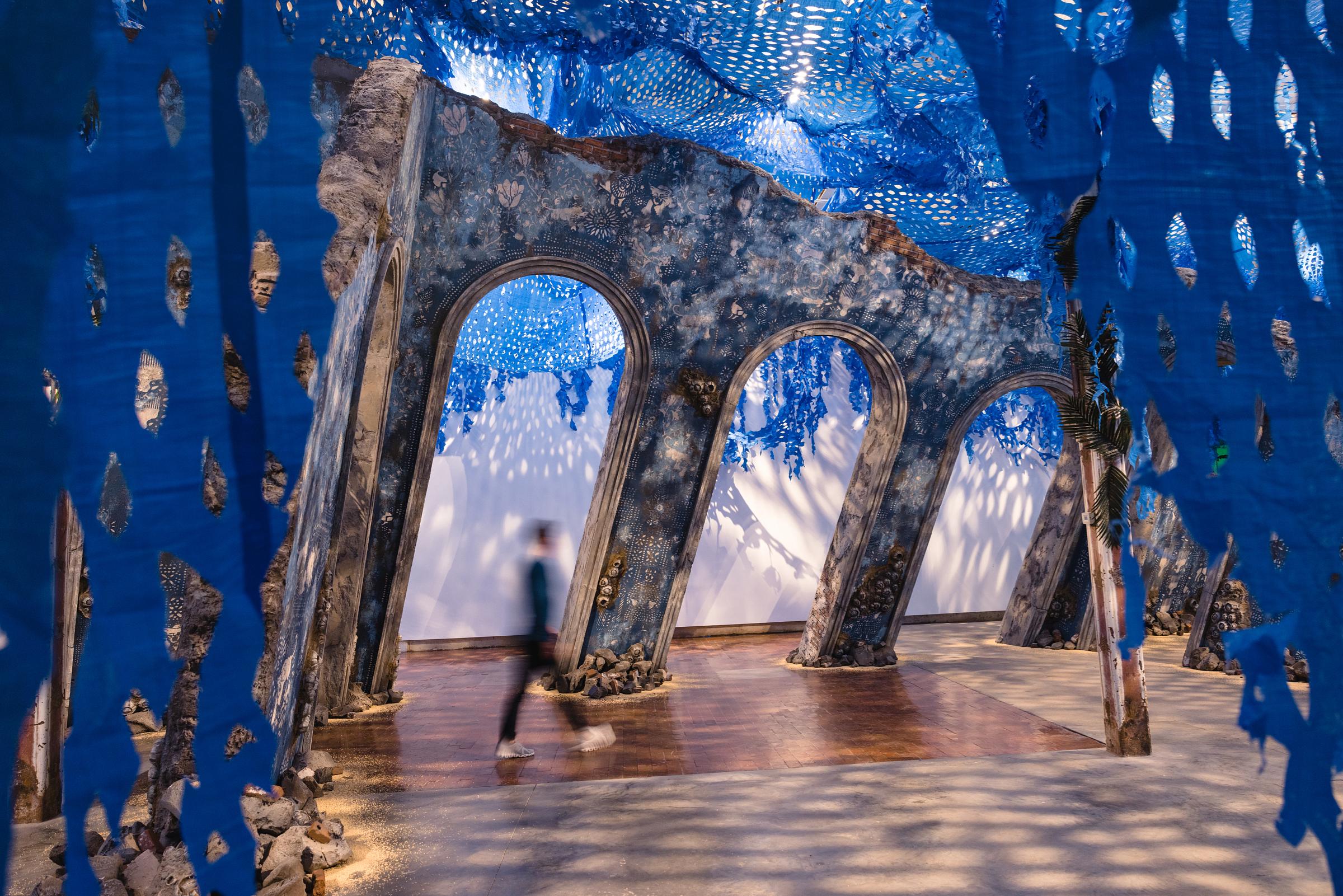 Walking into artist Firelei Báez’s To breathe full and free: a re-visioning, a correction (19°36’16.9“N72°13’07.0“W, 42° 21’48.762″ N 71°1’59.628″ W, 36° 22′ 0.1848’‘ N94° 12′ 8.64’’ W) is like walking into an undersea ruin.The blue tarps overhead refract light onto the ground as if a giant papel picado has been hung across the sky.