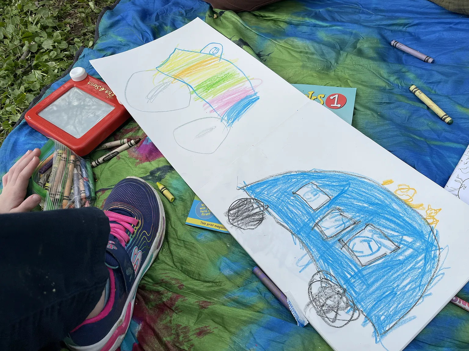 “No!” he said. He showed me his sketchbook. Inside was a drawing of a rainbow rectangle on wheels.