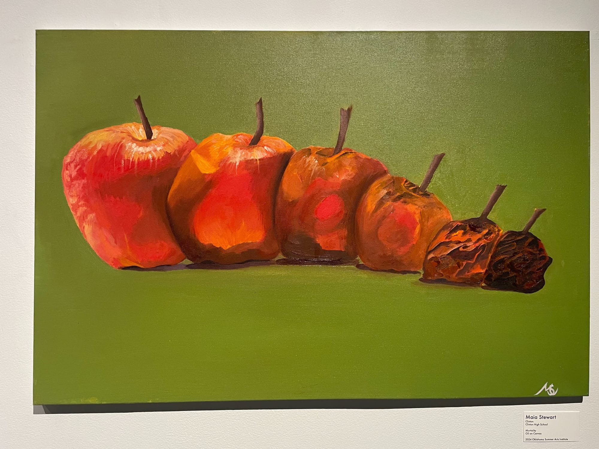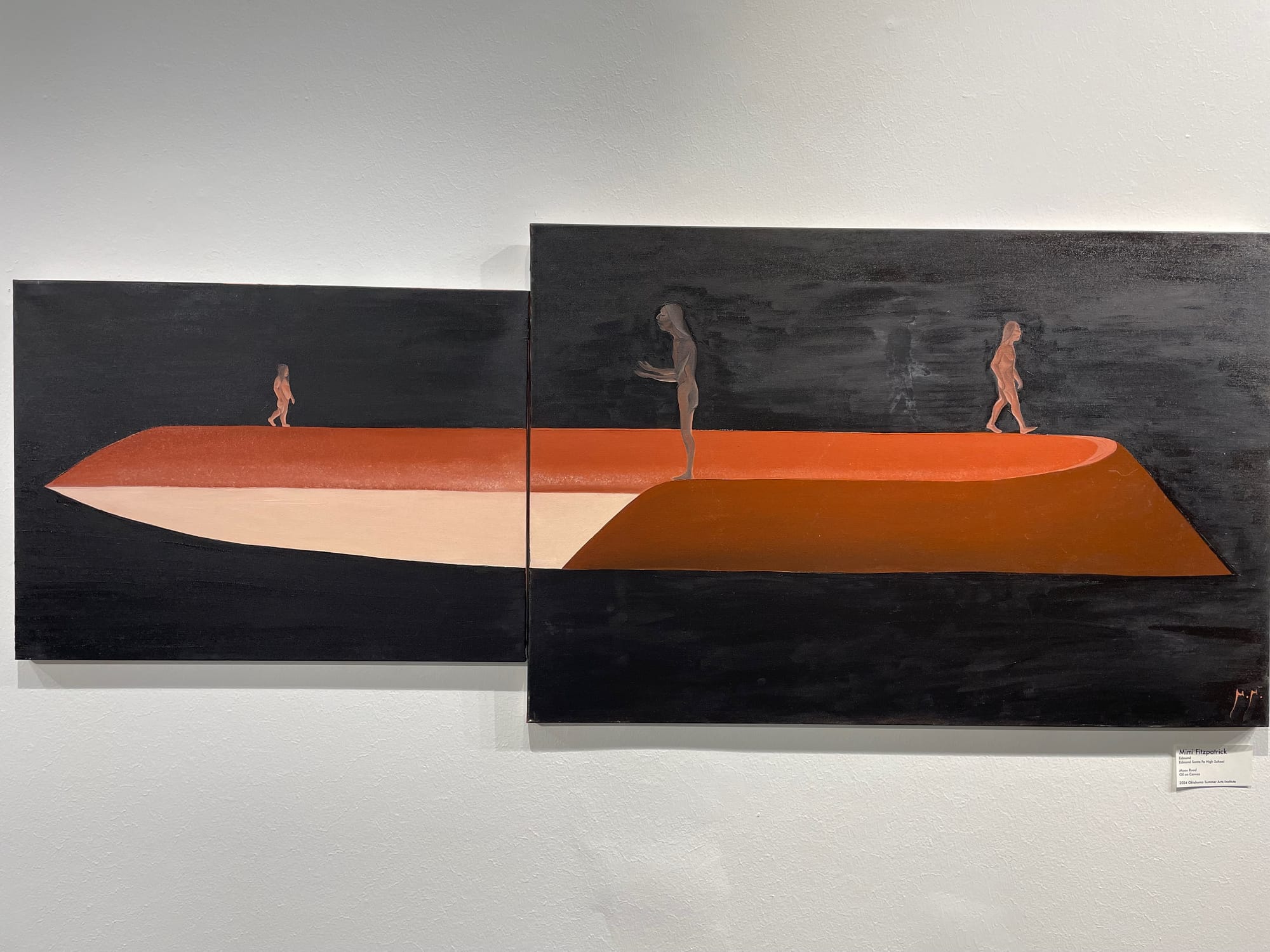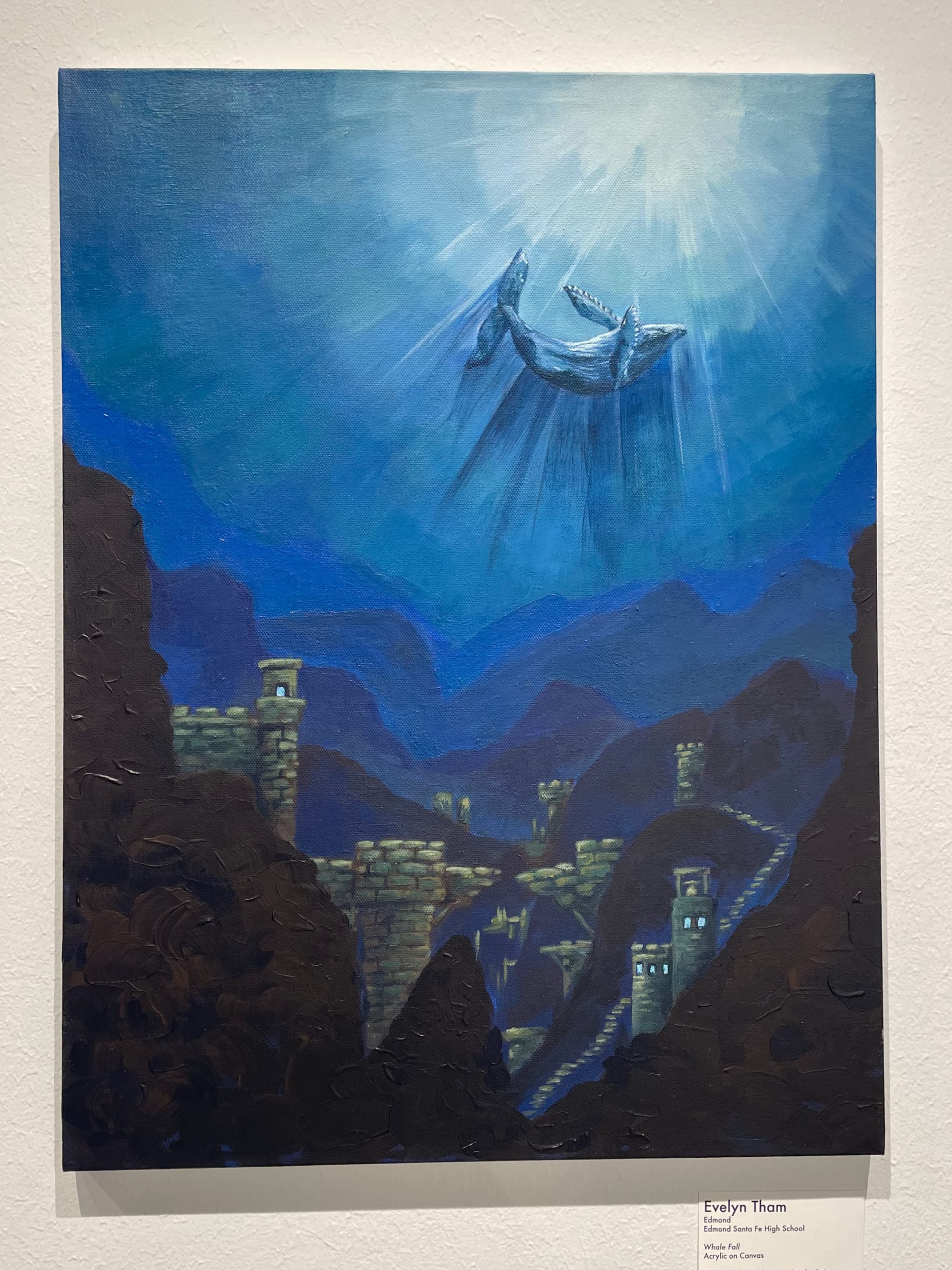 The work in the show is evocative and impressive—and it’s easy to qualify this statement by adding “especially for high school students,” but that isn’t really fair. Paintings like Moon Road by Edmond’s Mimi Fitzpatrick, Mortality by Clinton’s Maia Stewart, and Whale Fall by Edmond’s Evelyn Tham, among others, demonstrate an advanced commitment to form and nuance. They invite the eye and provide space for reflection, seeming to ask what’s missing in addition to what’s there.