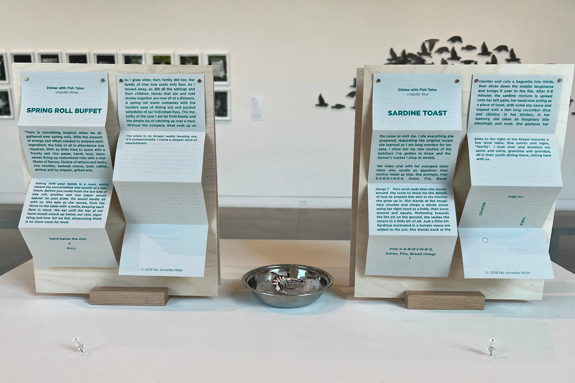 The Fishtallation sculptures were paired with Miller’s risograph pocket zines, titled Dishes with Fish Tales. Each zine shared a chapter from her collection of short stories based on meals remembered from her childhood. Her Spring Roll Buffet story ends with Miller stating, “Without the company, what ends up on my plate is no longer really feeding me; it’s unmemorable. I crave a deeper kind of nourishment.”