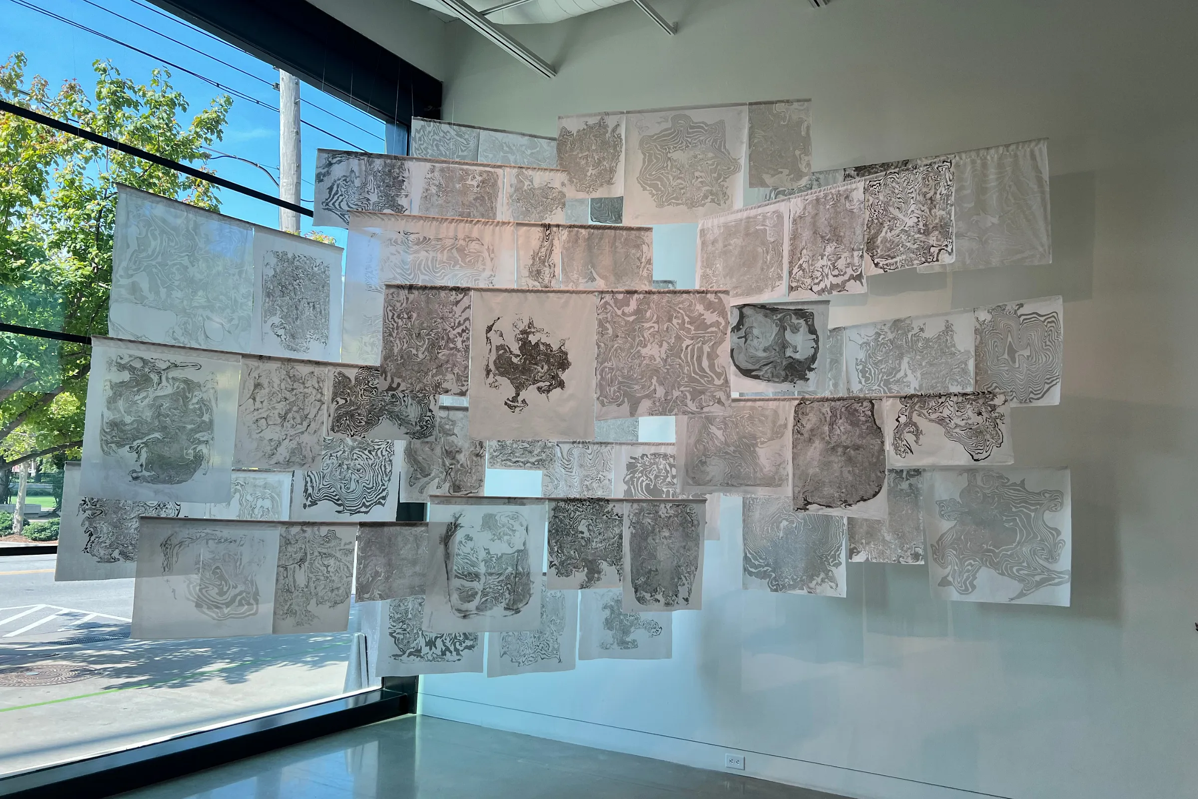 Earlier this spring Miller and Nichols independently presented projects that made their way into Natural Rhythms and serve as monumental keystones in the exhibition. Sonic Hum, a work supported by the Artists Creative Fund, was developed by Nichols at the “ROOMS” Annex as an interactive experience that invited participants to hum while their sound vibrations played through a speaker placed under a marbling bath. The sound vibrations animated the water and created marbled prints on fabric. Each person’s hum was then hung in the space in a real-time display of those who had visited and those who were still gathered. At 108, Nichols hangs the fabric prints from the ceiling in a cathedral-like display that takes up a full corner of the gallery. Each mark recalls the voices of individuals displayed in concert, creating a chorus of silent sound and felt presence.