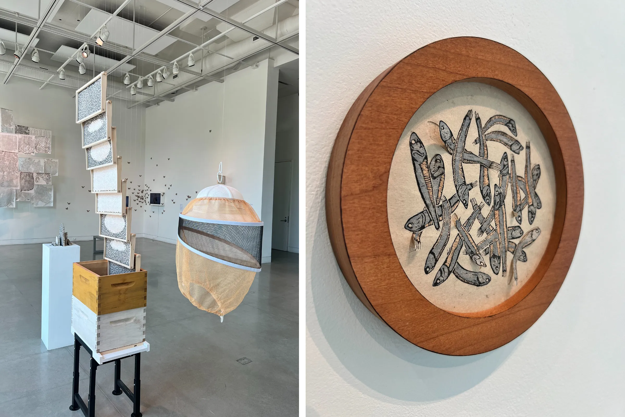 Within minutes of meeting Nic Annette Miller and Hayley Nichols at their two-person exhibition Natural Rhythms at 108 Contemporary, I was telling Nic about our fishing experience in New Mexico. This isn’t a new thing for her. Many people have shared fish memories, recipes and meditations at her Fishtallations (aka Fish Market Installations), which she has produced and performed for over ten years at farmer’s markets, craft fairs and festivals. I bet you have your own fish story. While Miller did not include a full Fish Market at 108, we did get a wall of crustaceans and fish. Sculptural serigraph prints of Spiny Lobster, Jumbo Shrimp, Cut Catfish and Sardines were all on view, along with a delicate basket of woodcut print paper sculptures of Dry Anchovies on dó paper, a handmade paper made from the inner bark of the dó tree and traditionally produced in many villages in Vietnam.