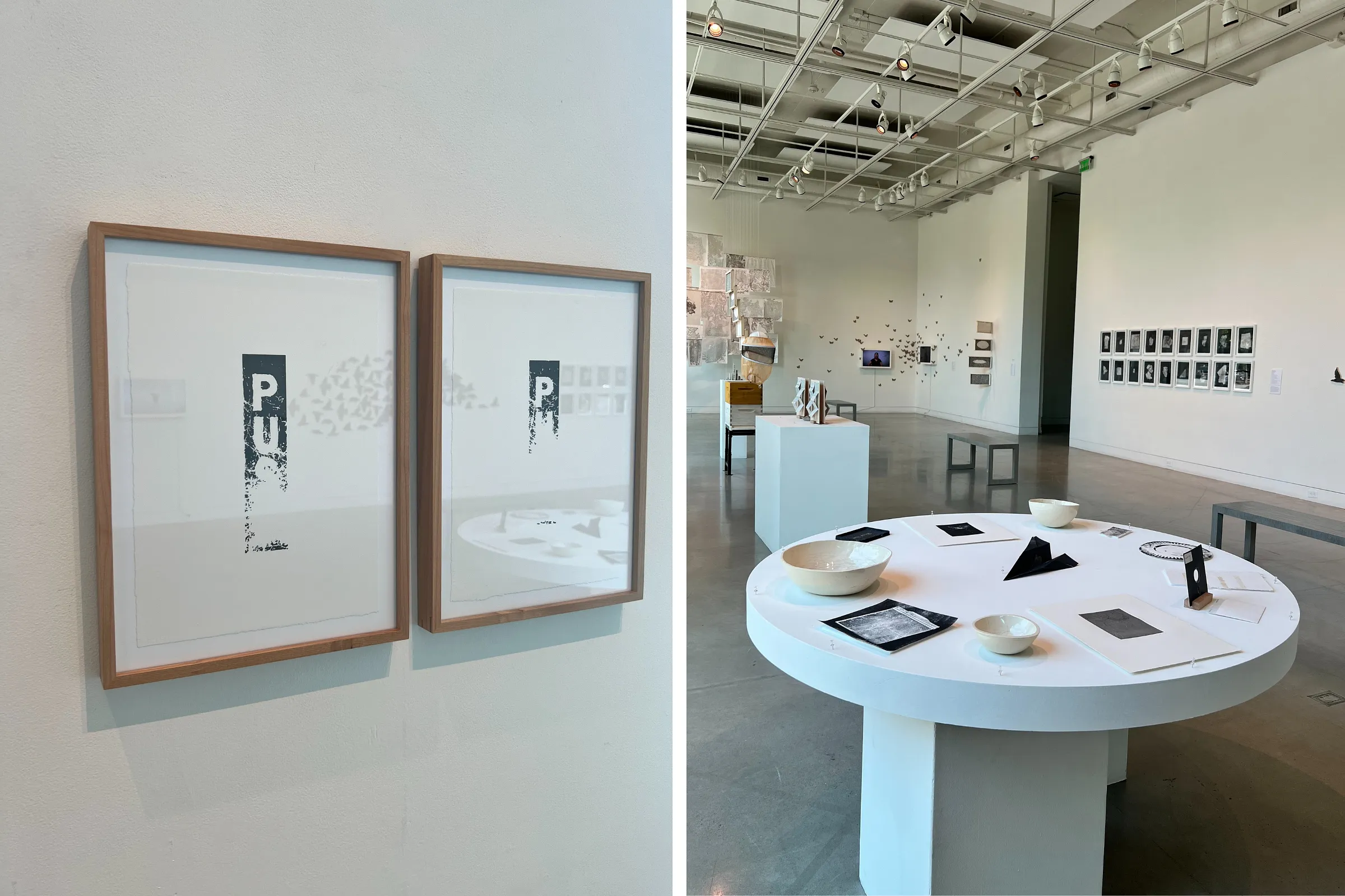 One of the first pieces one encounters in Natural Rhythms is a round table set with thirteen objects that show traces of human interaction and use. These works — like Marks of Sustenance (Medium), a ceramic bowl that shows the marks of spoons scraping the interior of the vessel, or The Last Paper Towel made of handmade paper with cotton and abaca, or Untitled (Studio Dogs), a collection of dog hair represented in a relief print — point to things left behind.