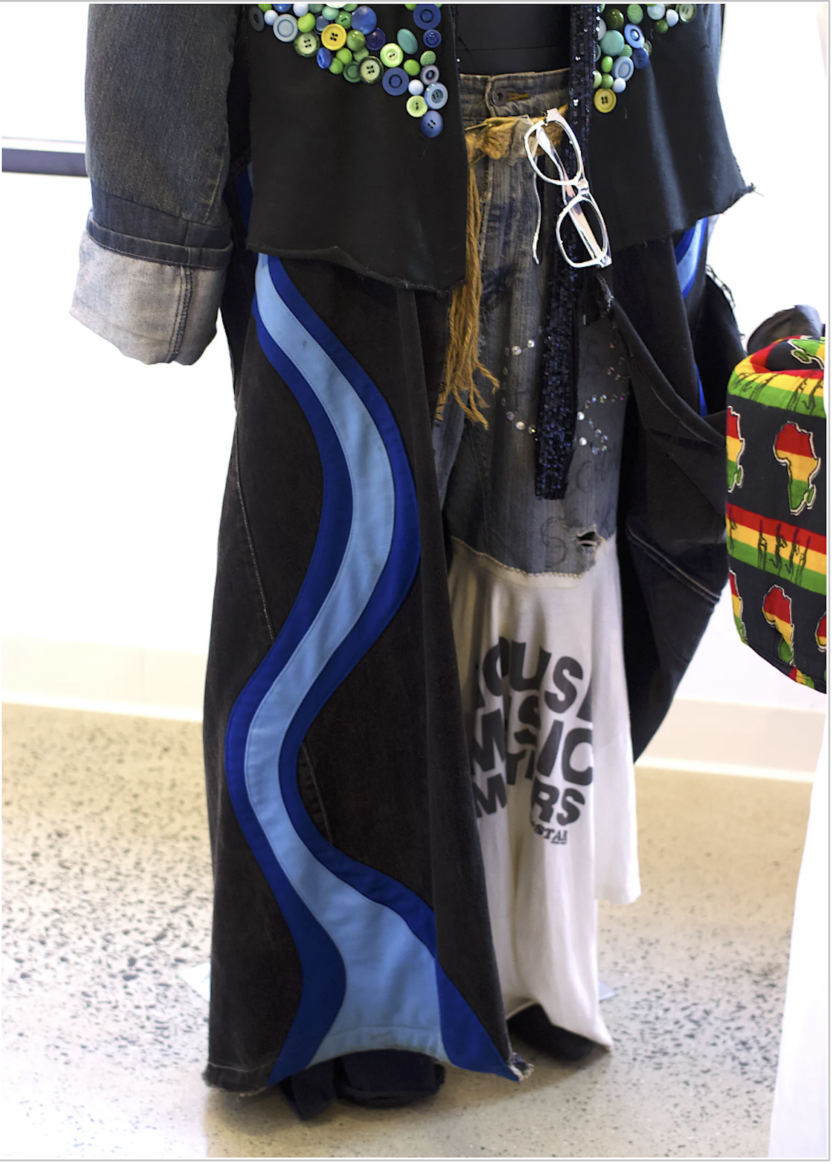The exhibit showcased dresses, jackets, vests, and more, all made with “trash” of some kind by nine local artists, including Carter. Materials included plastic bags, old T‑shirts, window screens, and credit cards. It was a surreal experience for Fraser, an example of fiction coming to life in real time.
