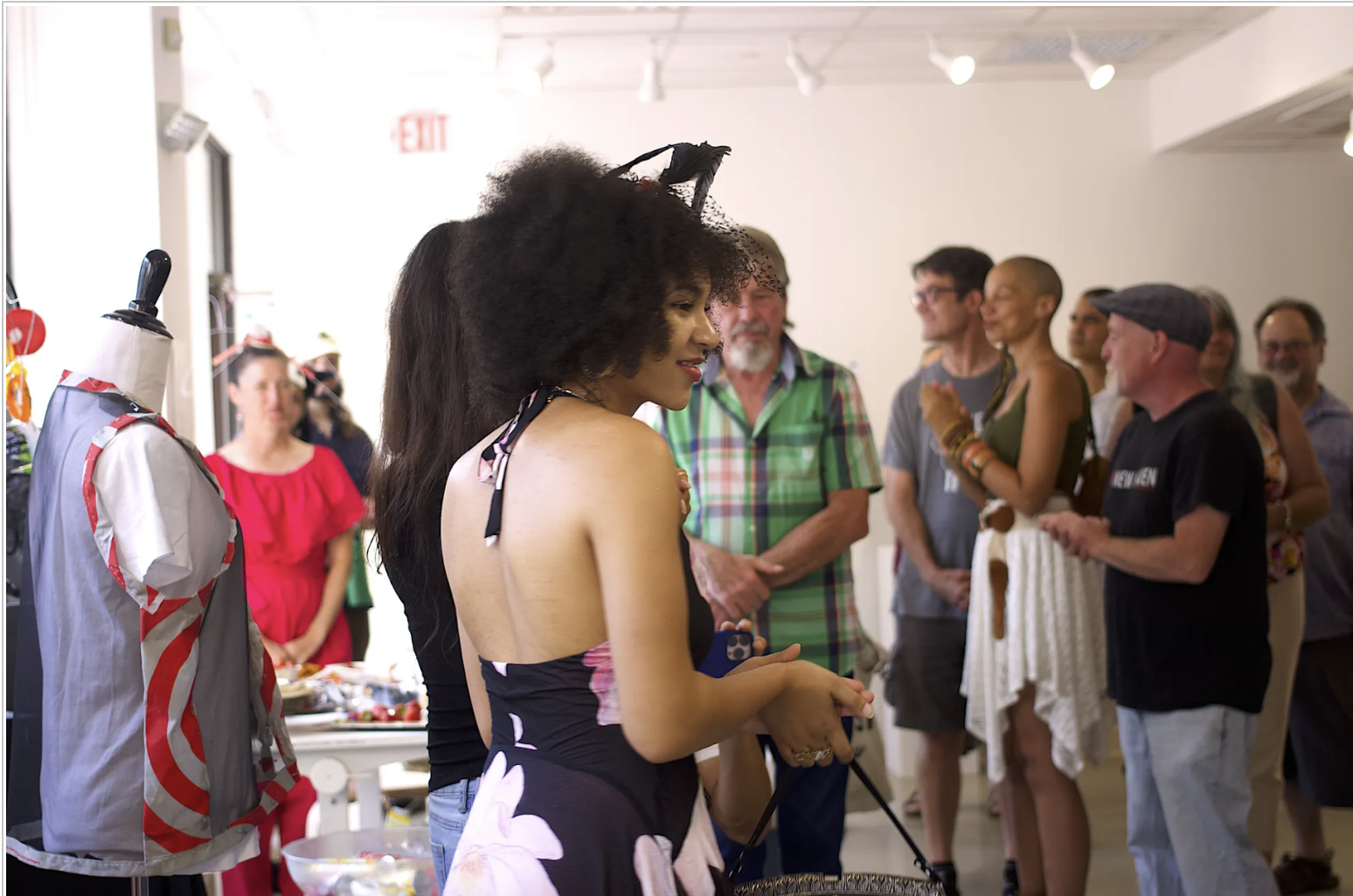 Carter wasn’t the only one wearing a custom-designed outfit at the show opening. Samore Orr, a student of fashion designer Catherine Cazes-Wiley, showed me her couture hat and handbag, designed by her teacher.