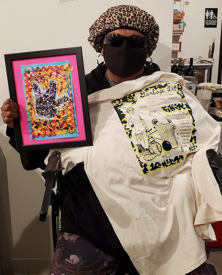 I chatted with a librarian who holds creative workshops that make art from found objects at local branches. She introduced me to one of the artists, a hearing-impaired woman who proudly held up one of her works — a vibrantly decorated, glitter-strewn collage of a hand signing the word for “love” — along with a T‑shirt for the event.